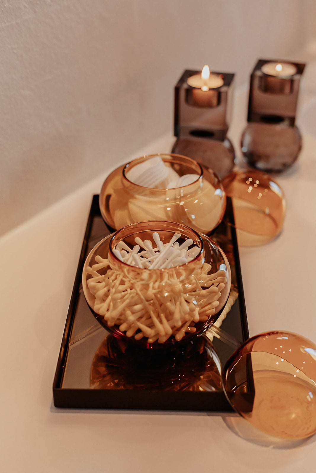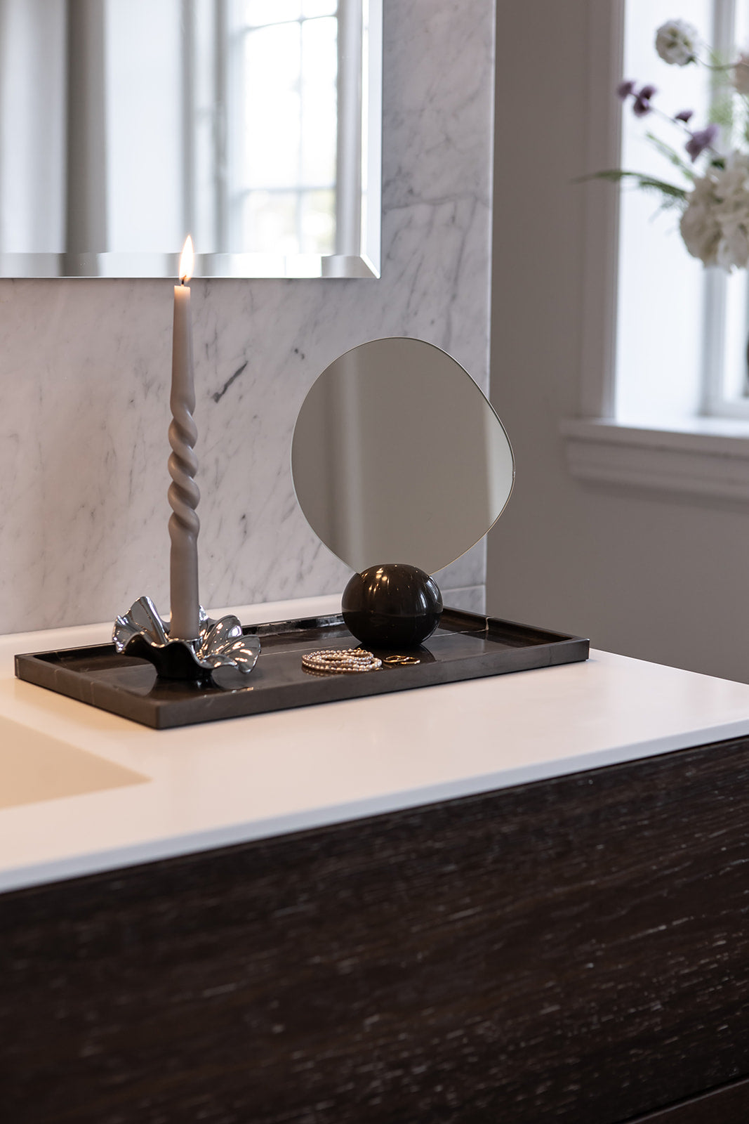 Små ting som parfume, cremer eller vatrondeller fortjener også en smuk ramme. Med vores bakker til badeværelset kan du samle produkterne på en måde, der både er praktisk og dekorativ. Vælg mellem marmorbakker eller firkantede bakker, som gør det let at skabe orden på badeværelsesbordet – samtidig med at de fungerer som et elegant designelement. Til de helt små detaljer, som smykker eller vatrondeller, er en bonbonniere et oplagt valg. På den måde bliver selv hverdagens nødvendigheder en del af indretningen og et dekorativt element i rummet.