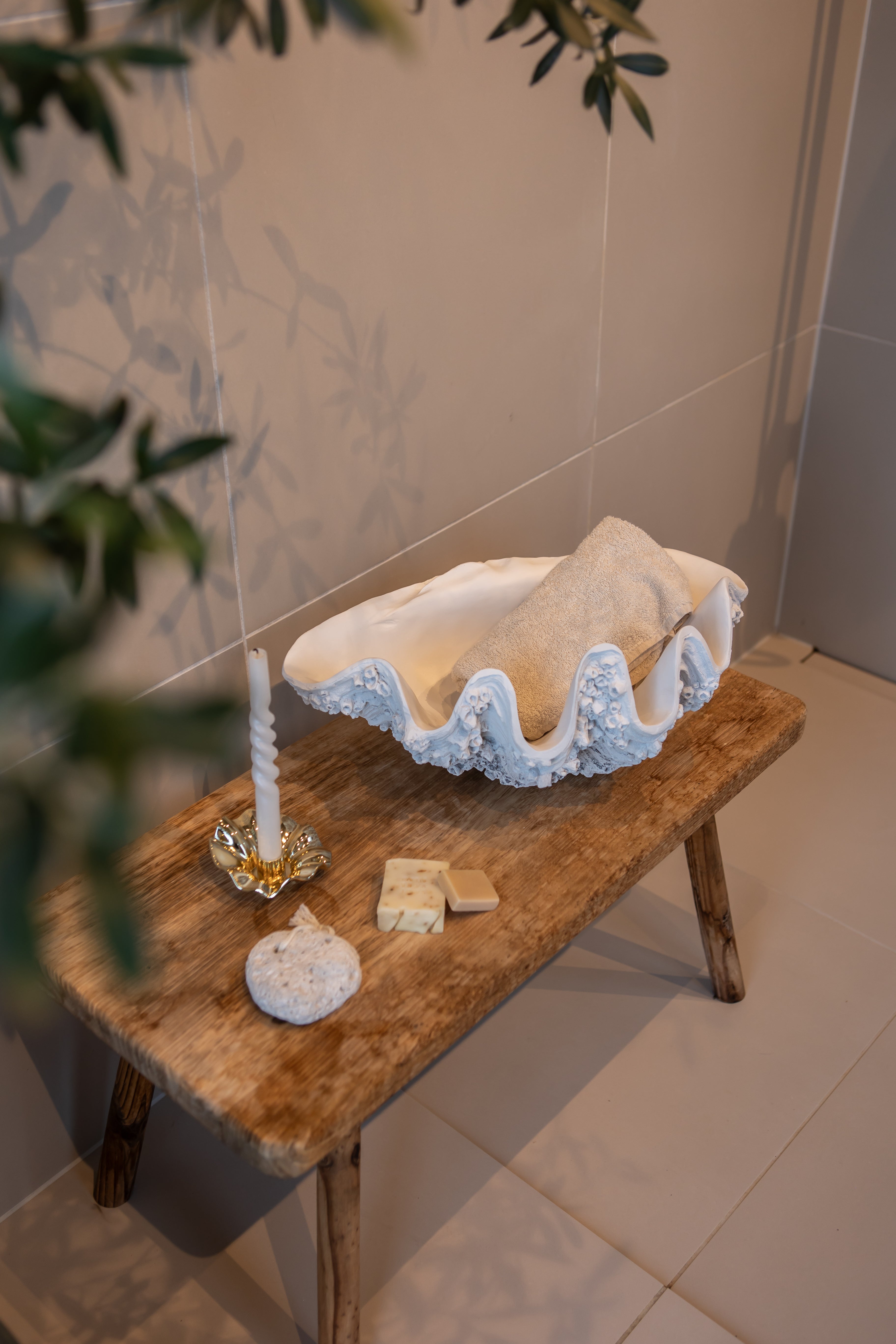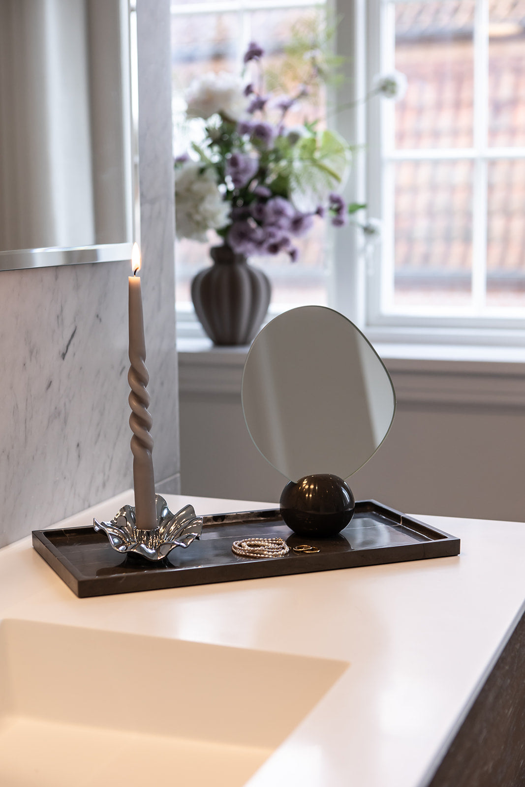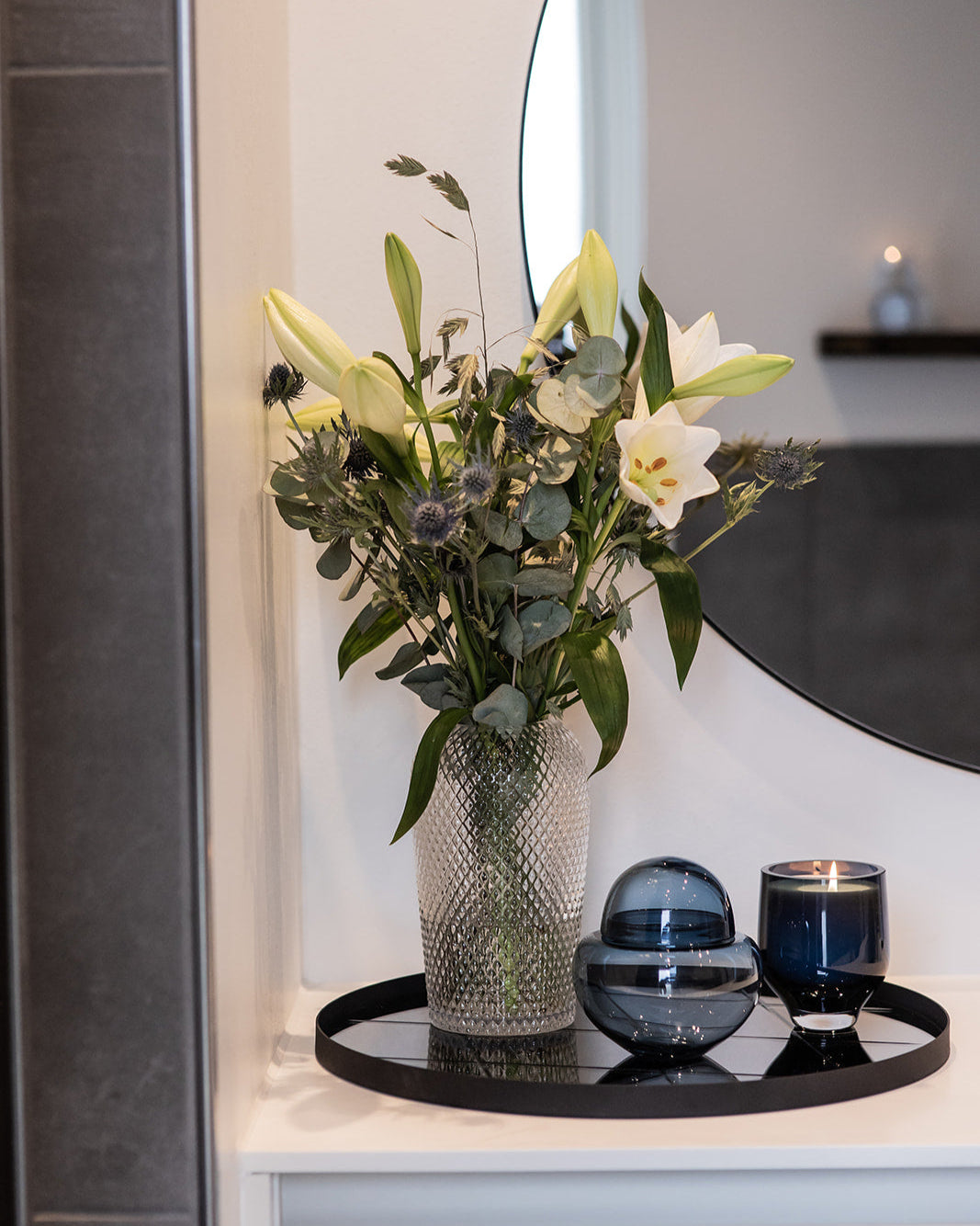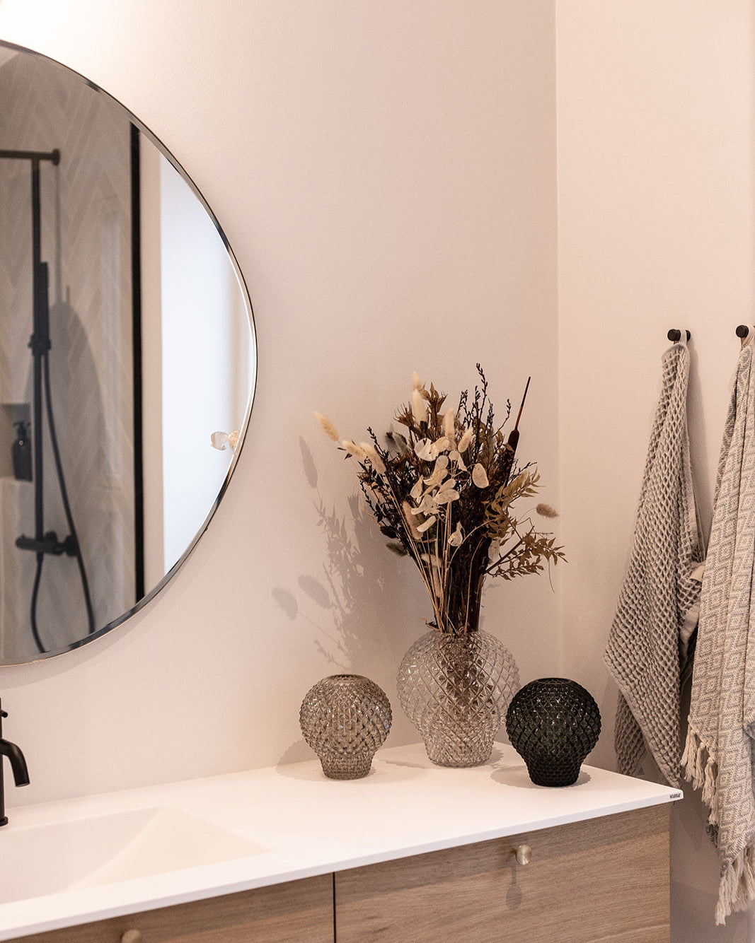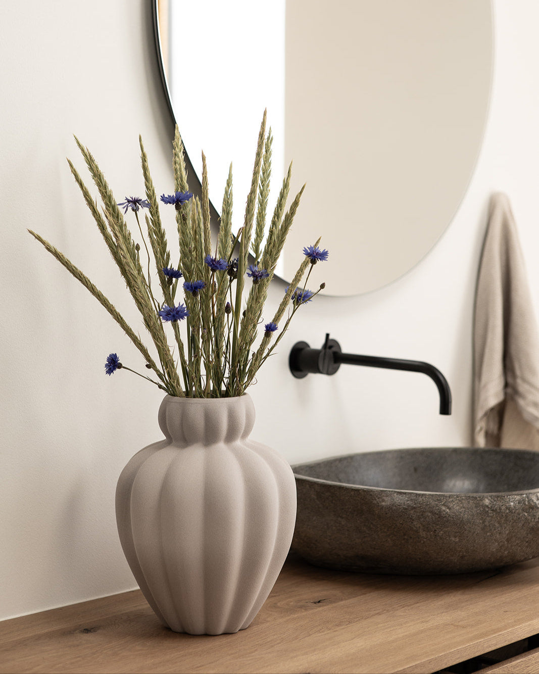 Vil du tilføre dit badeværelse en følelse af spa, kan du kombinere vores vaser med kunstige blomster eller stilke, der aldrig mister deres friskhed. Suppler med lysestager, stagelys og duftlys, der giver varme og sanselighed. Tænd et lys ved badekarret eller vasken, og du har skabt dit eget lille frirum til velvære. Små detaljer som blomster og levende lys forvandler rummet fra funktionelt til stemningsfuldt og gør dine daglige rutiner til små øjeblikke af forkælelse. Det er den slags detaljer, der giver badeværelset en atmosfære af luksus og nærvær.