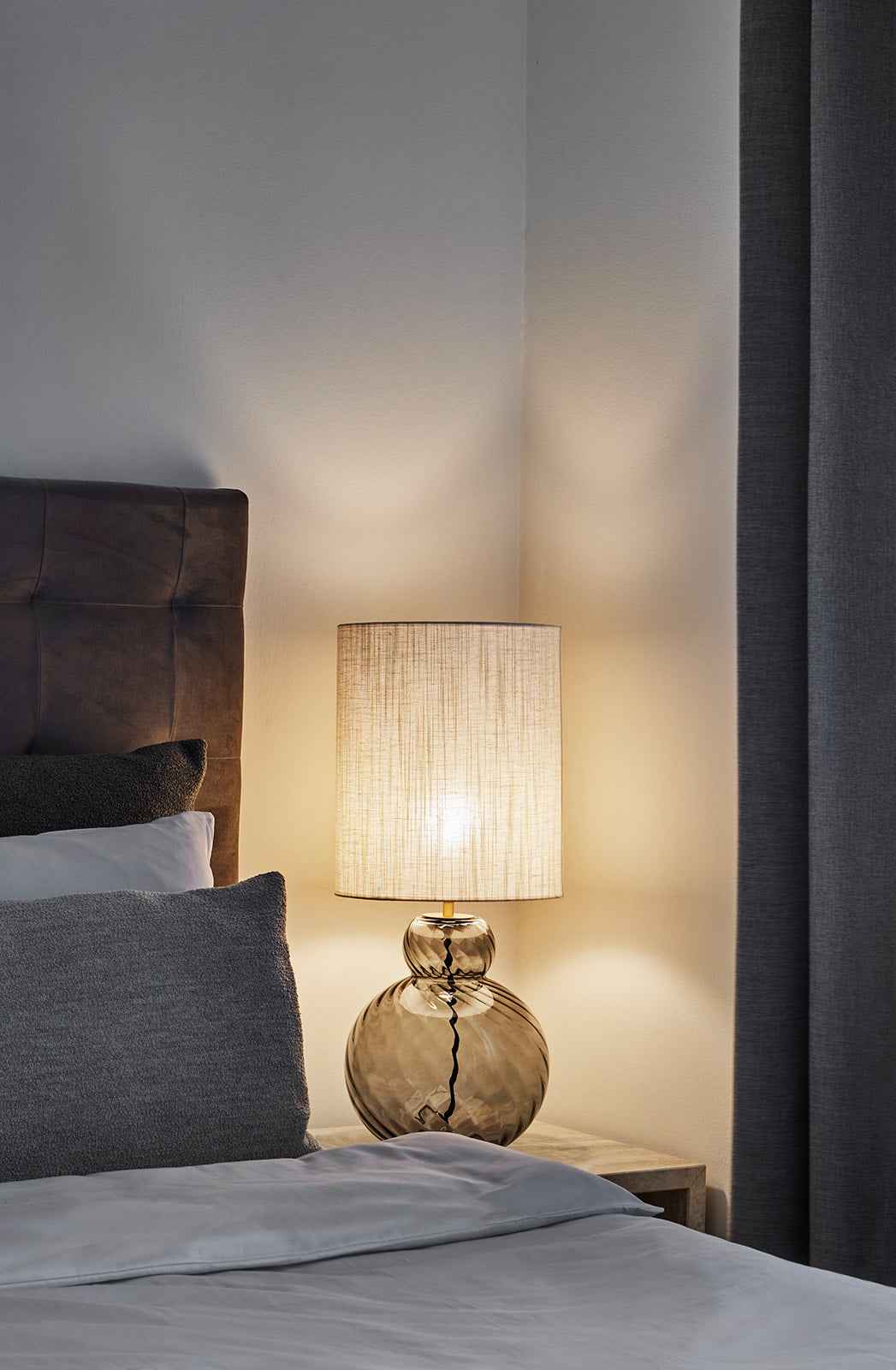 Belysning er afgørende i soveværelset. Det handler både om funktion og stemning. En enkel loftlampe kan suppleres af bordlamper ved sengen, som giver et blødt og varmt lys. Har du to sengepladser, kan ens lamper skabe et klassisk og afbalanceret udtryk, der binder rummet sammen.