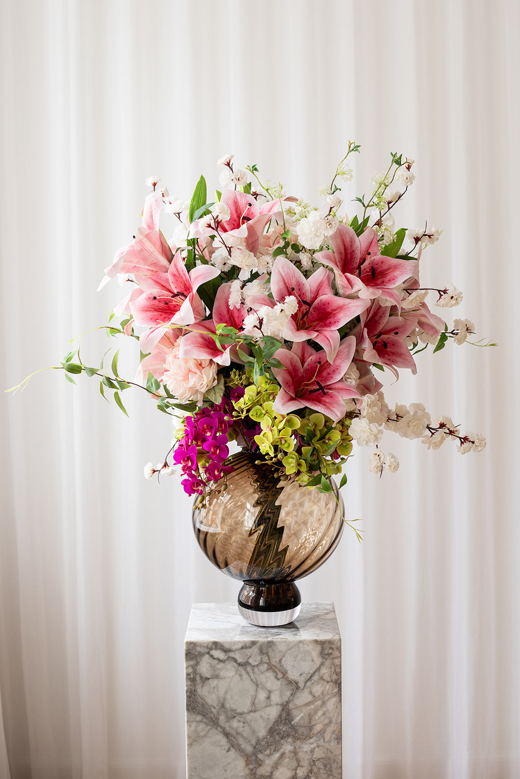 Buketterne er færdigbundet af vores personale og fremstillet af naturtro kunstige blomster i høj kvalitet. De kræver ingen vanding og holder sig smukke i mange år. Ønsker du at ændre udtrykket, kan du nemt skifte enkelte stilke. Du er altid velkommen til at kontakte os eller komme forbi vores butik i hjertet af Aarhus, hvor vi gerne hjælper dig.