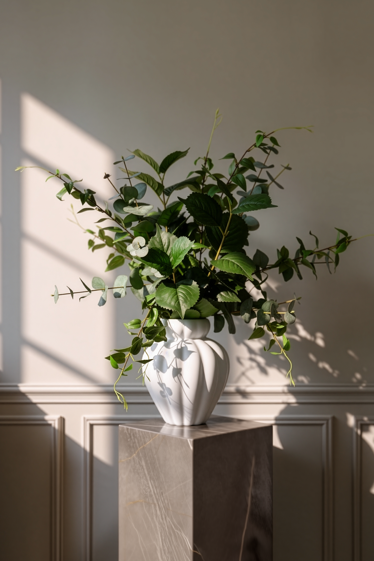 Buketten kan stå alene og give et roligt udtryk, men er også oplagt som udgangspunkt, hvis du vil tilføje farve og sæsonpræg. På den måde kan du løbende opdatere din indretning uden at udskifte hele blomsterdekorationen.