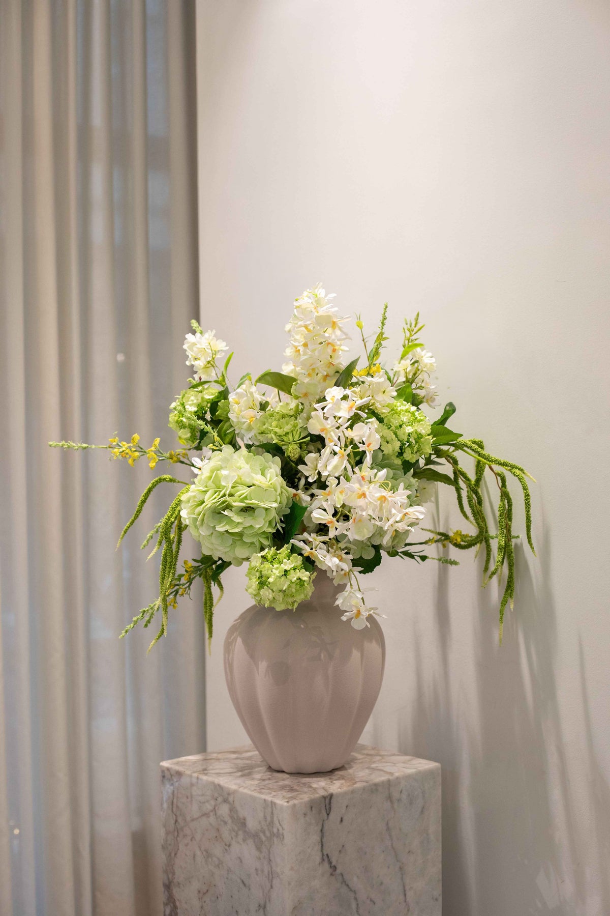 Sommer Haven er en let og frodig buket i friske grønne nuancer og bløde hvide blomster. De luftige stilke og det grønne fylde giver et naturligt, levende udtryk, der passer smukt ind i både lyse og mørke rum.
