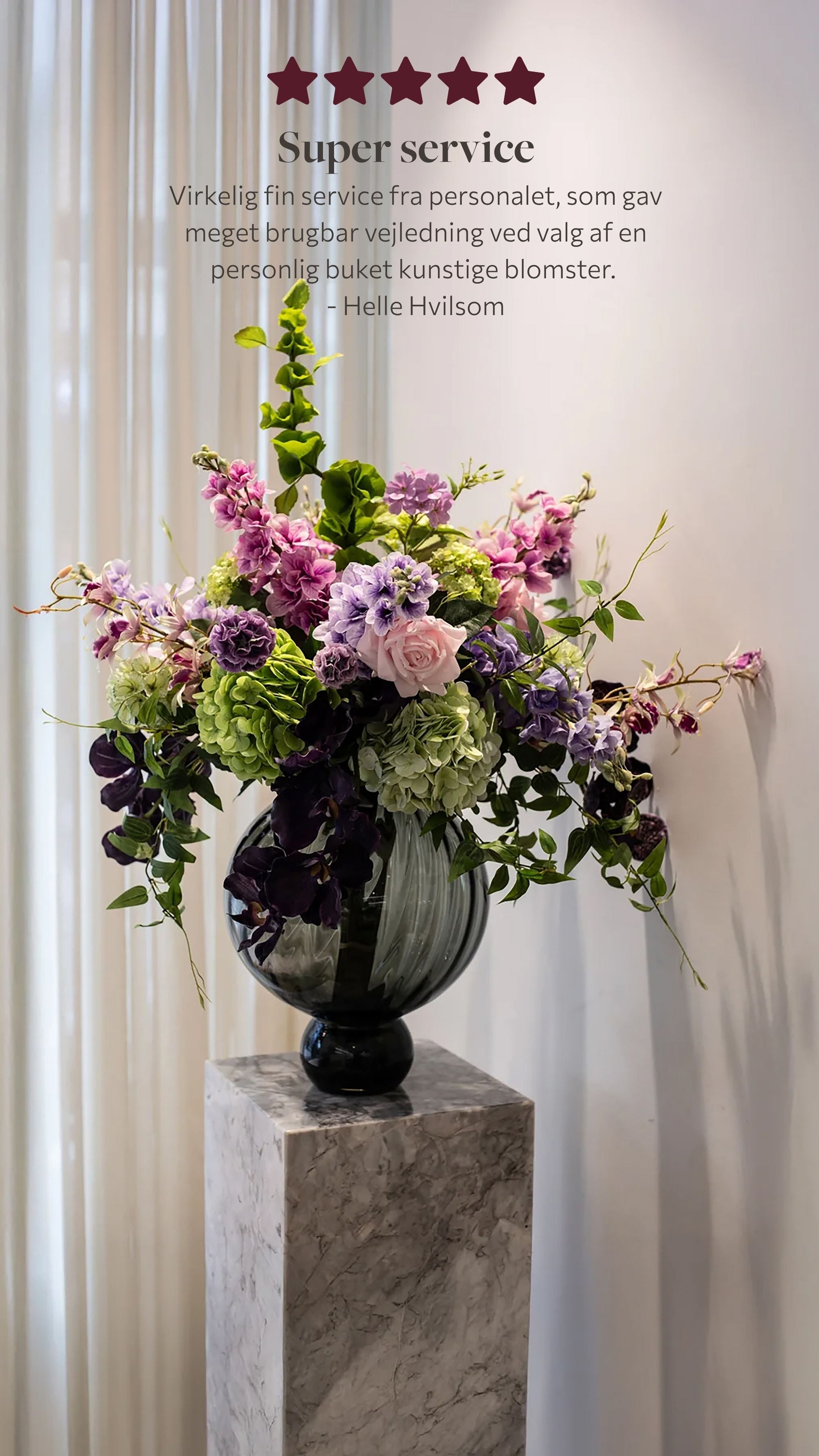 En af de store fordele ved kunstige buketter er, at de holder sig smukke i mange år. Hvor friske blomster hurtigt mister farve og form, bevarer vores buketter deres friske udseende og livlige farver sæson efter sæson. Hvis du ønsker fornyelse, kan du nemt opdatere din buket med enkelte stilke – se udvalget her for at skabe et nyt udtryk. Du kan også finde idéer i vores artikel Opdater din buket med få nye stilke, hvor vi guider dig til små ændringer, der gør en stor forskel.