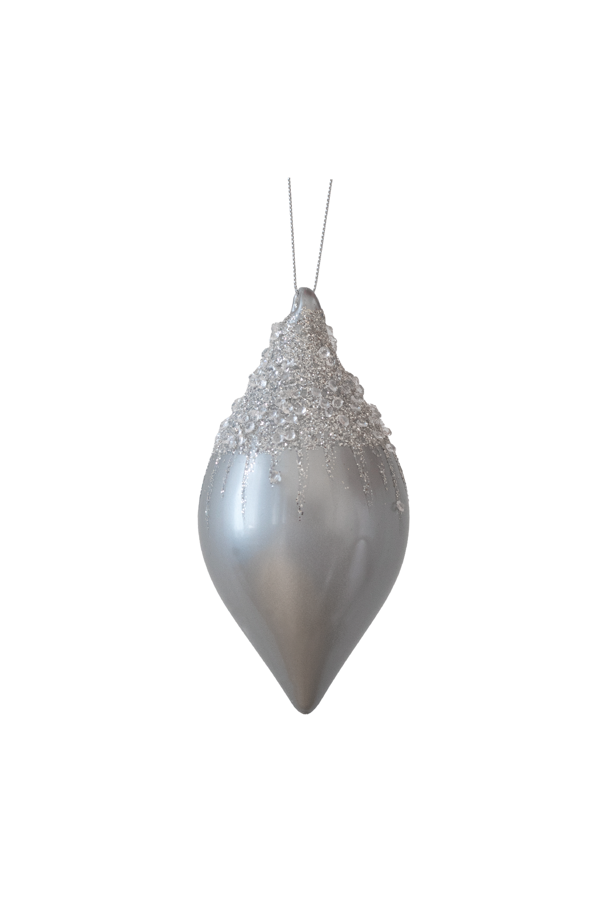 Denne smukke julekugle i sølv med krystal detaljer og dråbeformet design er skabt til at bringe elegance og vinterstemning ind i dit hjem. Brug den som blikfang i ophæng, på grene eller i juledekorationer og oplev dens diskrete spil af lys og skygge.