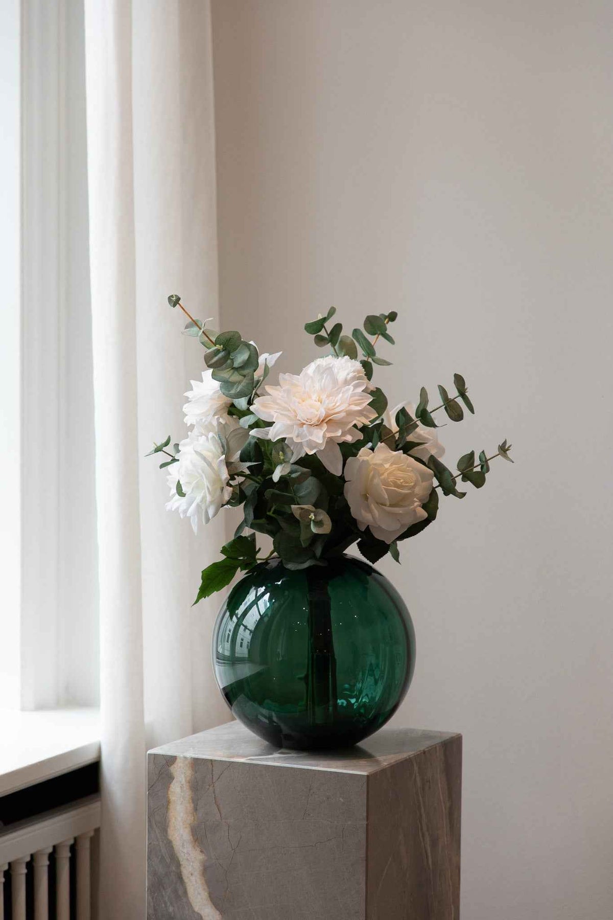 Bring vinterens magi ind i hjemmet med julebuketten Frostens Magi. De sarte hvide blomster kombineret med friske grønne toner skaber et roligt og sofistikeret udtryk, der passer perfekt til julens hyggelige stemning. Buketten er professionelt færdigbundet af vores personale og skabt med naturtro stilke i høj kvalitet, så den holder sig smuk år efter år. Du kan nemt udskifte eller tilføje stilke for at give buketten et nyt udtryk. Se også vores matchende juledekorationer for at fuldende looket. Du er altid velkommen til at besøge vores butik i Aarhus, hvor vi gerne hjælper dig med at forny eller binde din buket om.