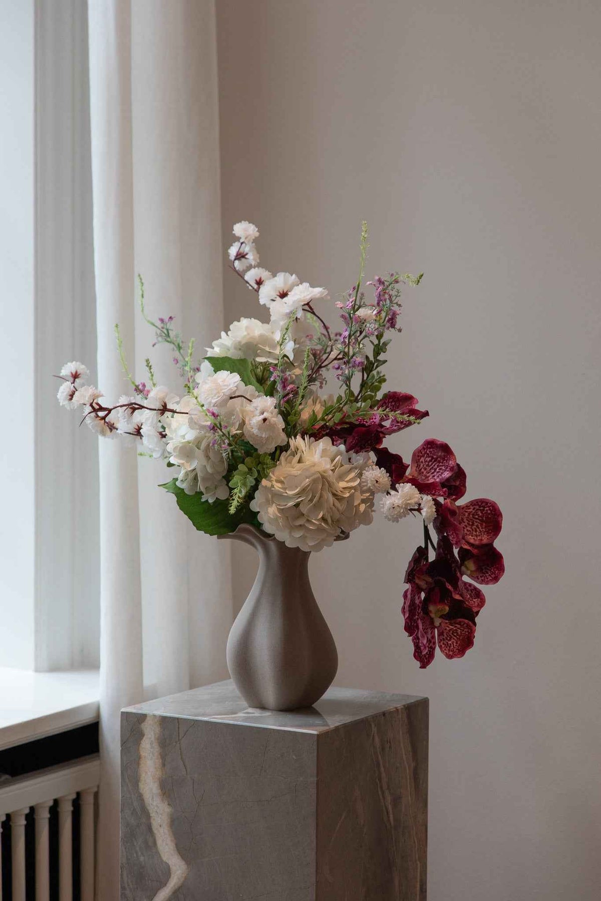 Hjertevarme julebuketten byder på en varm og elegant sammensætning af hvide og dybt røde toner, som giver et smukt og klassisk udtryk til julens hyggelige stunder. Buketten skaber en hjertevarm stemning og er perfekt til at bringe tradition og fornyelse ind i hjemmet. Buketten er professionelt færdigbundet og lavet af naturtro stilke i høj kvalitet, så den holder sig smuk år efter år. Du kan nemt udskifte eller tilføje stilke for at give buketten et nyt udtryk. Se også vores matchende juledekorationer for at fuldende looket. Du er altid velkommen til at besøge vores butik i Aarhus, hvor vi hjælper dig med at fornye eller binde din buket om.