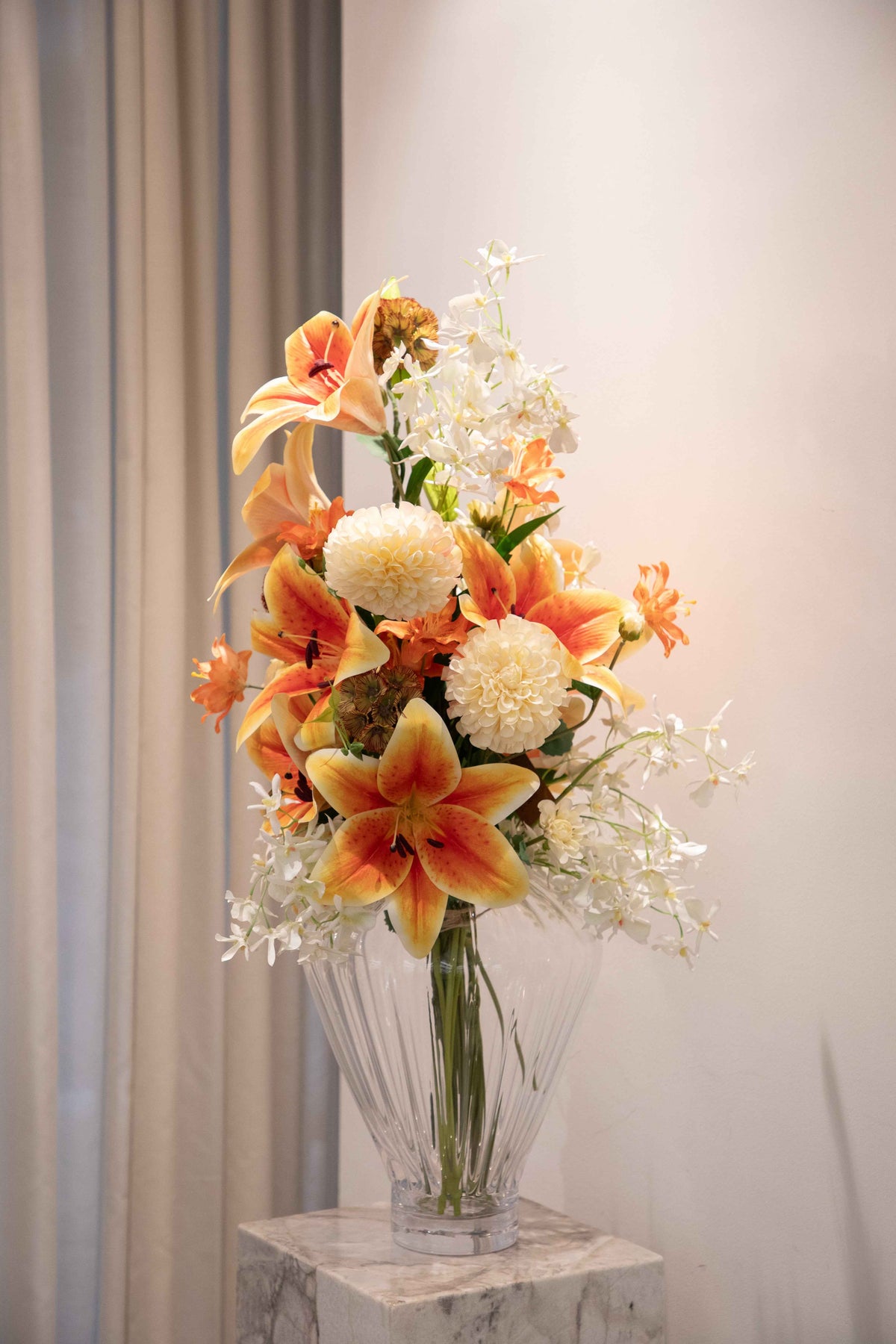 Efterårsdrøm - buket 105 er en professionelt færdigbundet buket, skabt med naturtro kunstige blomster i varme efterårsfarver. Buketten er designet til at bevare sit autentiske udtryk år efter år. Den kræver ingen vanding eller vedligeholdelse. Stilkene kan udskiftes, så udtrykket nemt kan ændres. Buketten er et holdbart og fleksibelt alternativ til friske blomster. Den giver dig et stilrent udtryk uden besvær.