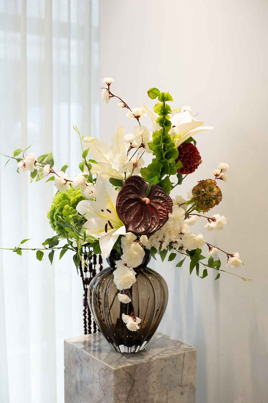 Fødselsdagsbuket No.2 blev skabt i anledning af Specktrums 1-års jubilæum i hjertet af Aarhus. Buketten kombinerer lyse toner med markante detaljer og er sammensat af nøje udvalgte naturtro blomster, der skaber et festligt og elegant udtryk.