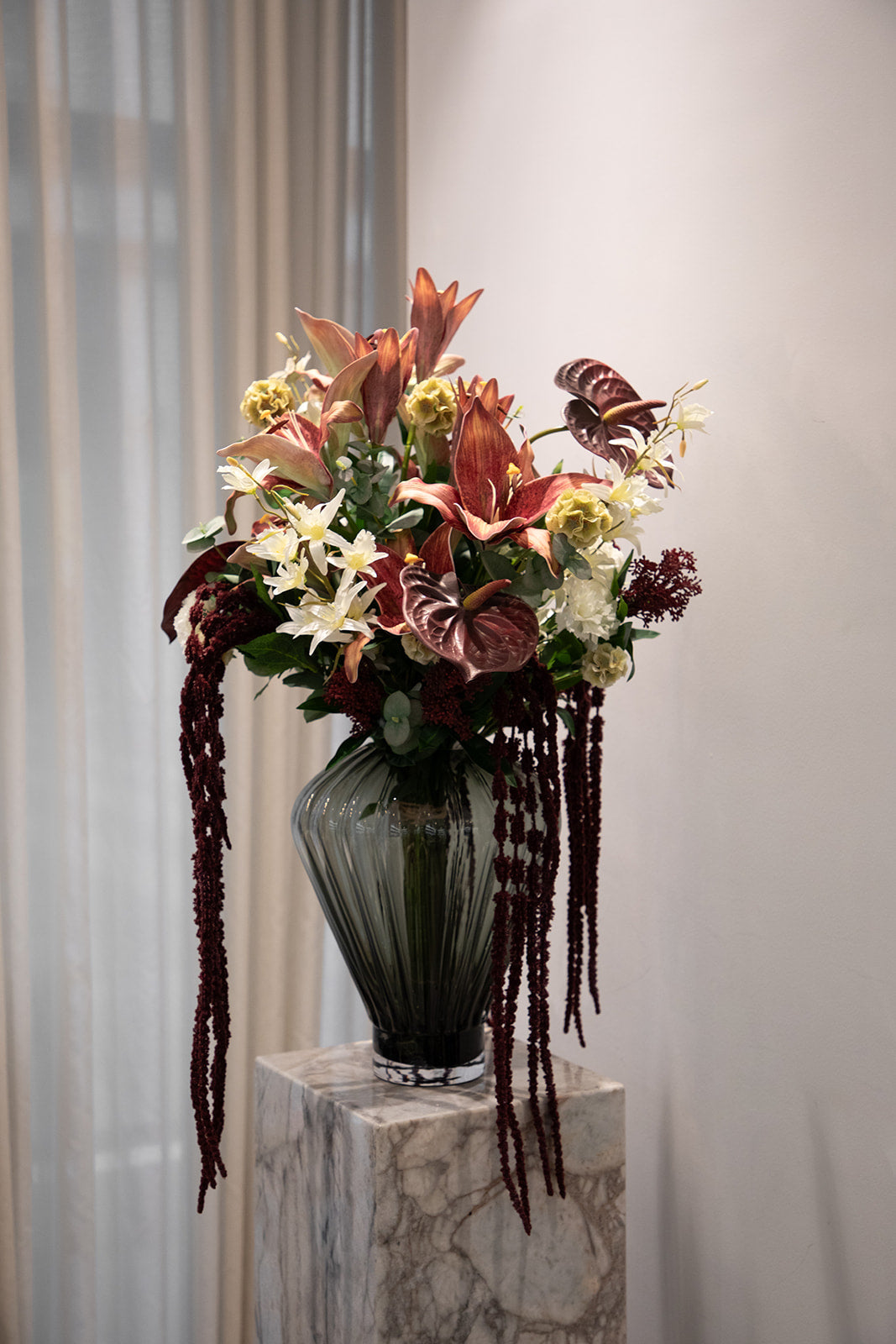Mørkerød Magi er en overdådig og sanselig buket, hvor dybe røde og varme nuancer smelter sammen i et dramatisk og luksuriøst udtryk. Buketten skaber en følelse af dybde, varme og efterårsstemning.