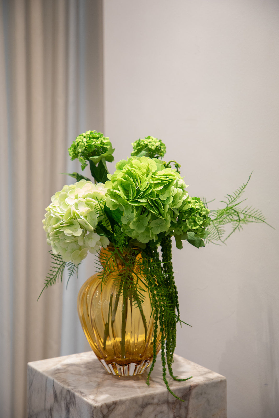 Skovglimt er en frisk fortolkning af naturens grønne nuancer. De frodige hortensia og lette bregner skaber en rolig, organisk balance, der bringer følelsen af frisk skovluft ind i hjemmet.