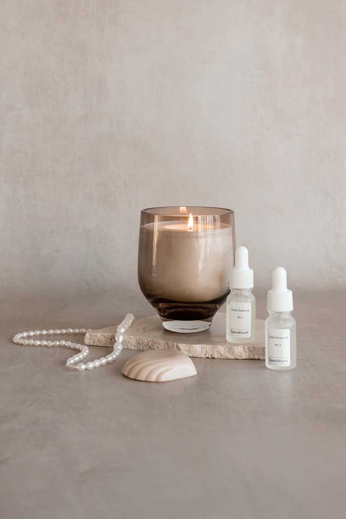 Skab dit eget duftlys med Specktrum Scent. Hver æske indeholder et kvalitetslys i et smukt mundblæst glas samt to pipetter med vores særligt udviklede dufte – inspireret af naturlige og forfriskende noter.