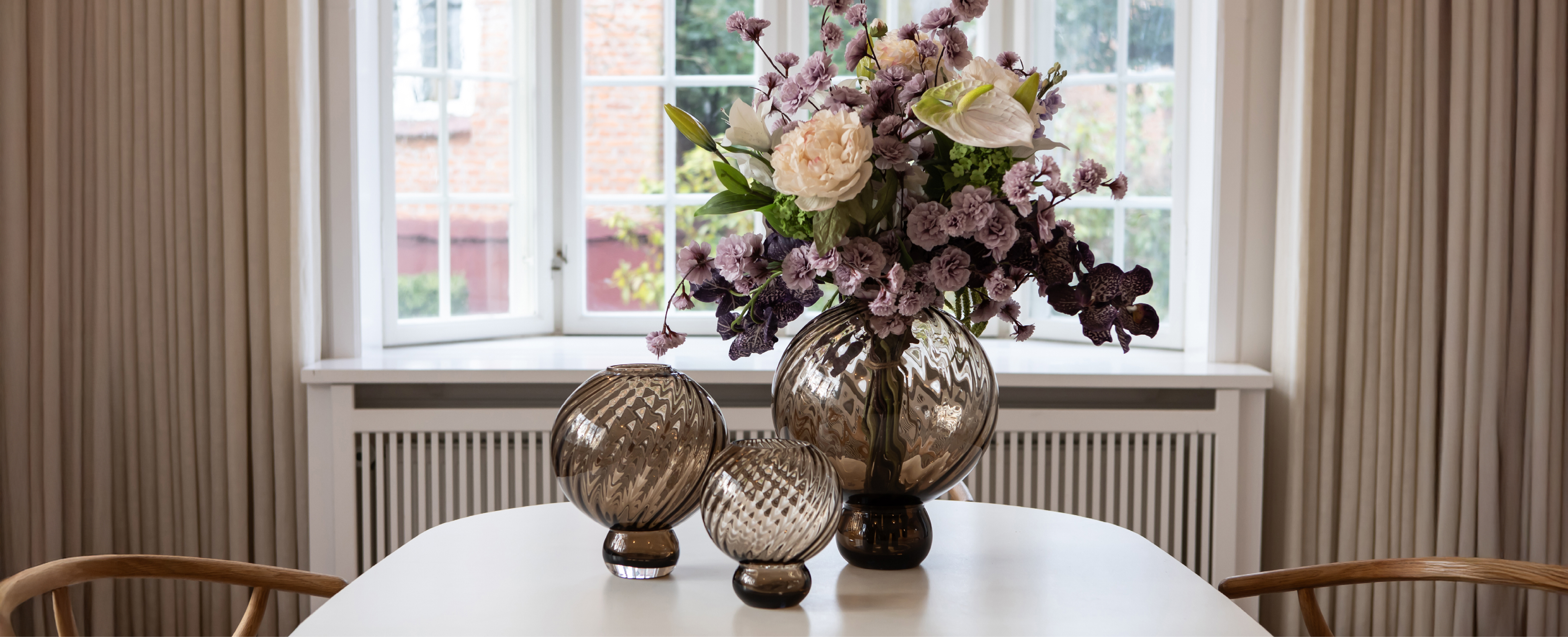 En rund vase er ideel til blomster, fordi formen naturligt fremhæver blomsternes bevægelse. Du kan style den med vores kunstige blomster i sarte pasteltoner om foråret, skabe frodighed med farverige buketter om sommeren eller tilføje dybde med bordeaux og grønne grene i efteråret. I vinterhalvåret kan en enkel stilk i en hvid eller grå vase skabe et minimalistisk udtryk med masser af stemning.