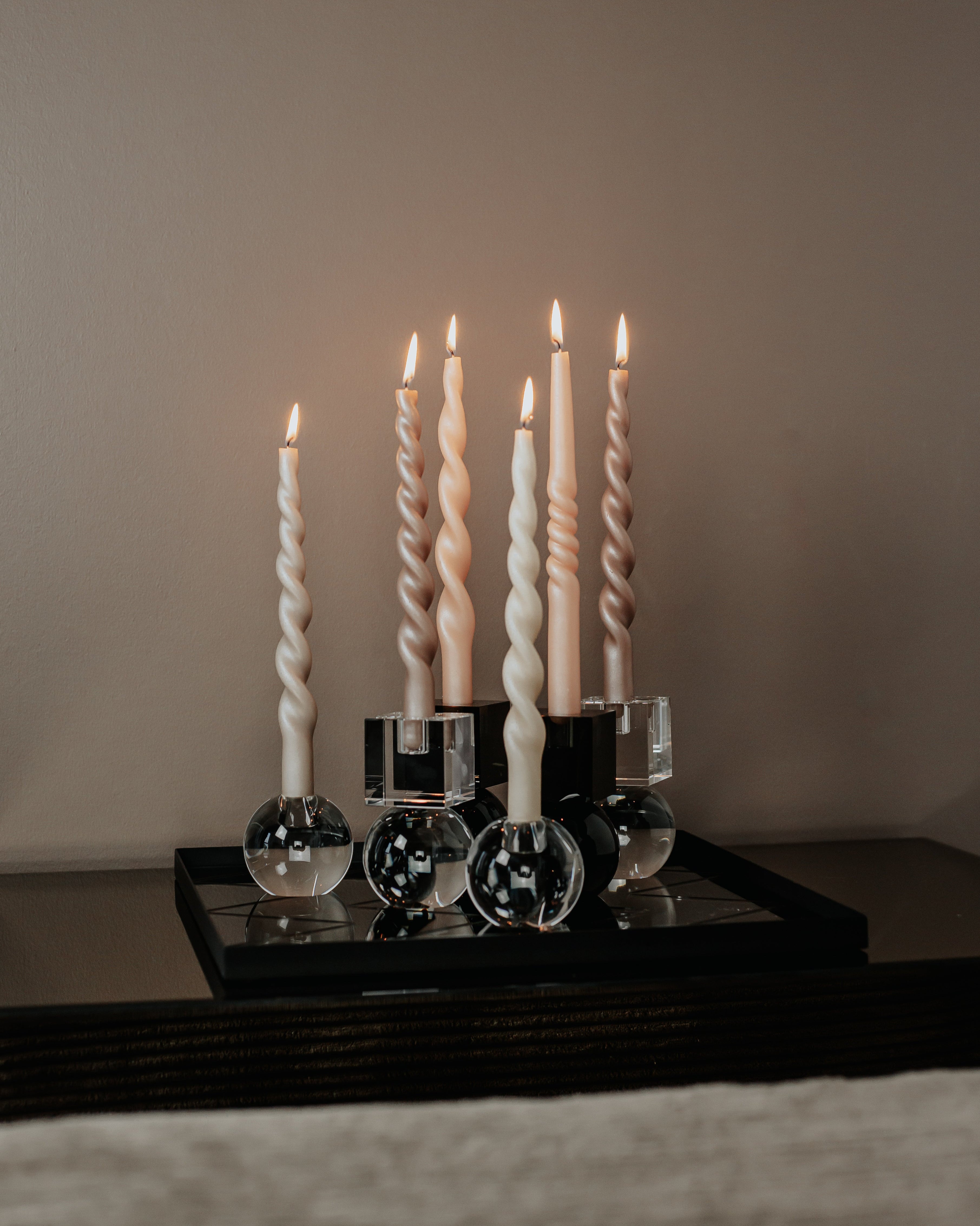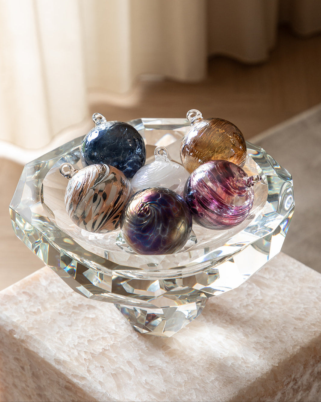 Glaskugler er smukke i vindueskarmen, hvor de reflekterer dagslyset og skaber en levende atmosfære. Kombinér vintage glaskugler med levende lys i lysestager, eller lad jule glaskugler pynte i december. En lille samling kan hurtigt forandre hele rummet med sit spil af lys og farver.