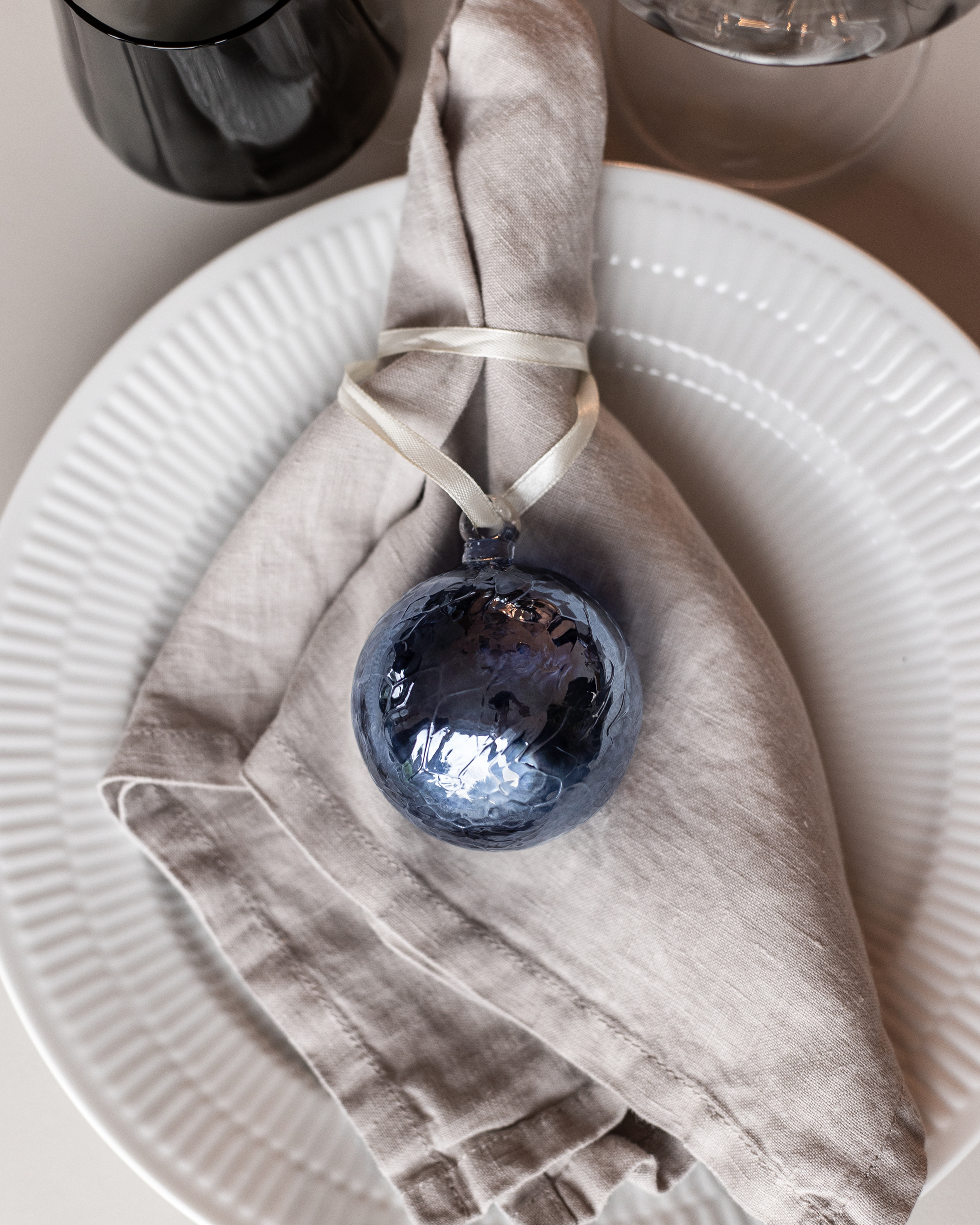 Når spisebordet skal dækkes smukt, er dekorationskugler og sløjfer oplagte som en del af borddækningen. Placer julesløjfer på tallerkenerne rundt om servietterne, eller lad store glaskugler og farvede glaskugler indgå som små dekorationer mellem glas, vinglas, kander og skåle. Det giver et personligt og stemningsfuldt udtryk, der gør både hverdagsmiddage og gæstebud særlige.