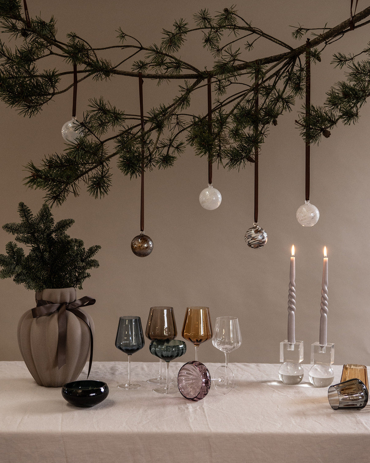 Glaskugler til ophæng kan hænge over spisebordet som et poetisk og dekorativt element. De fanger lyset og tilfører en lethed i indretningen, som skaber variation i højden. Kombinér dem med julesløjfer i december eller med små glaskugler for at skabe en sammenhængende og personlig stil.