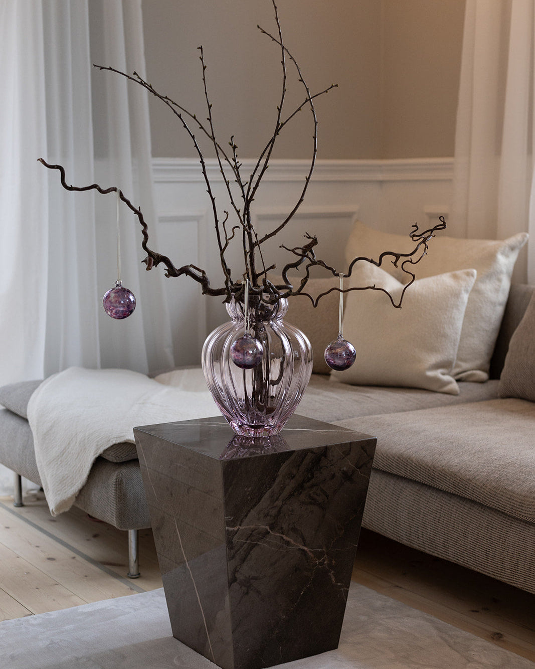 Dekorationskugler kan nemt blive en del af hverdagens indretning. Lad små glaskugler ligge i en dekorativ skål eller på en bakke sammen med vaser, lysestager og blomster. På den måde får du en stemningsfuld detalje, der binder rummet sammen og giver plads til personlighed.