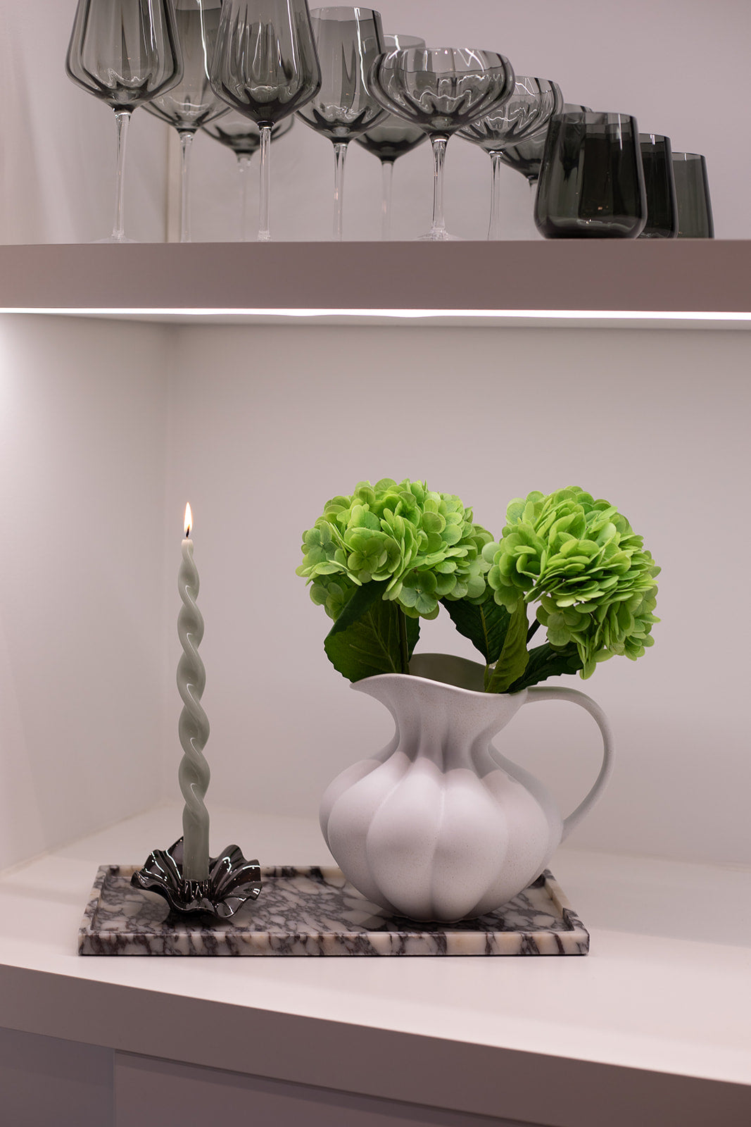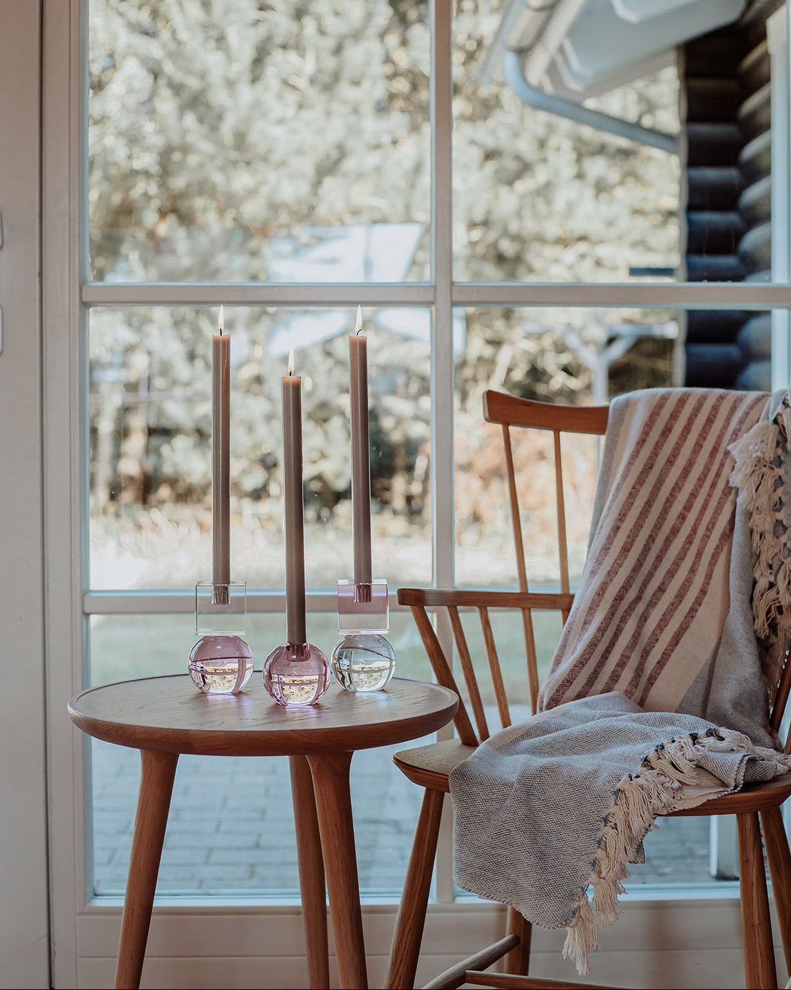 En glasstage kan stå alene som et æstetisk designobjekt eller kombineres i grupper for at skabe dynamik. Når de matches med vores lange stearinlys, snoede stearinlys eller farvede stearinlys, kan du let variere udtrykket alt efter årstid, anledning eller humør. Glassets rene form og transparente overflade gør det til et tidløst materiale, der altid passer ind i indretningen.