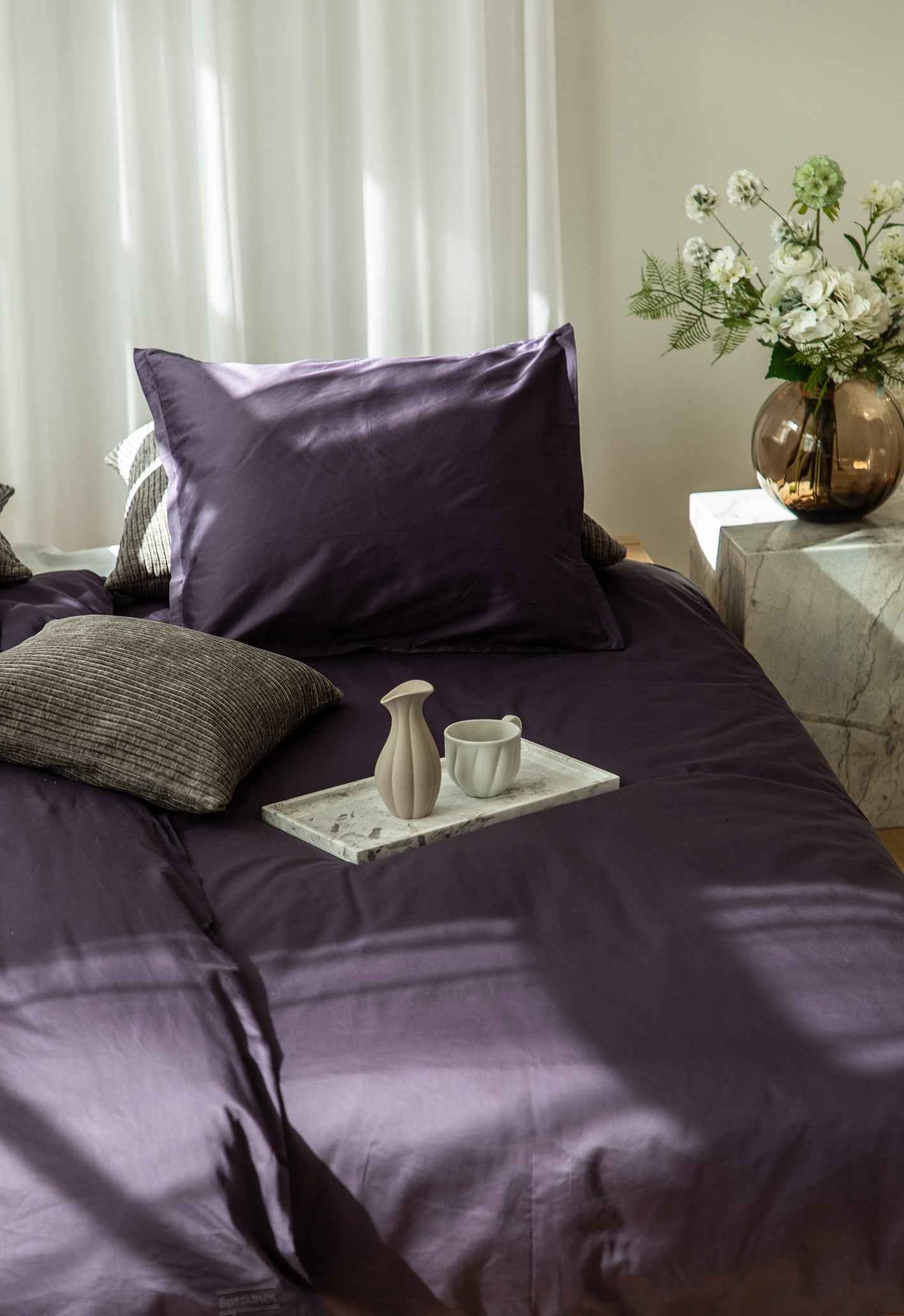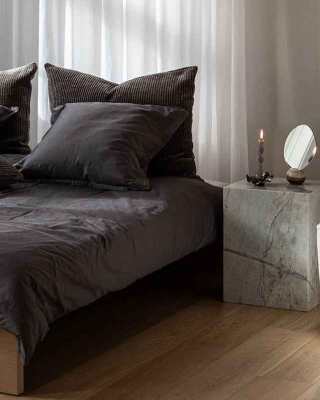 Vores ensfarvet sengetøj giver en følelse af ro og orden, og fungerer som en visuel base, du kan bygge videre på med puder, plaider og gulvtæpper.