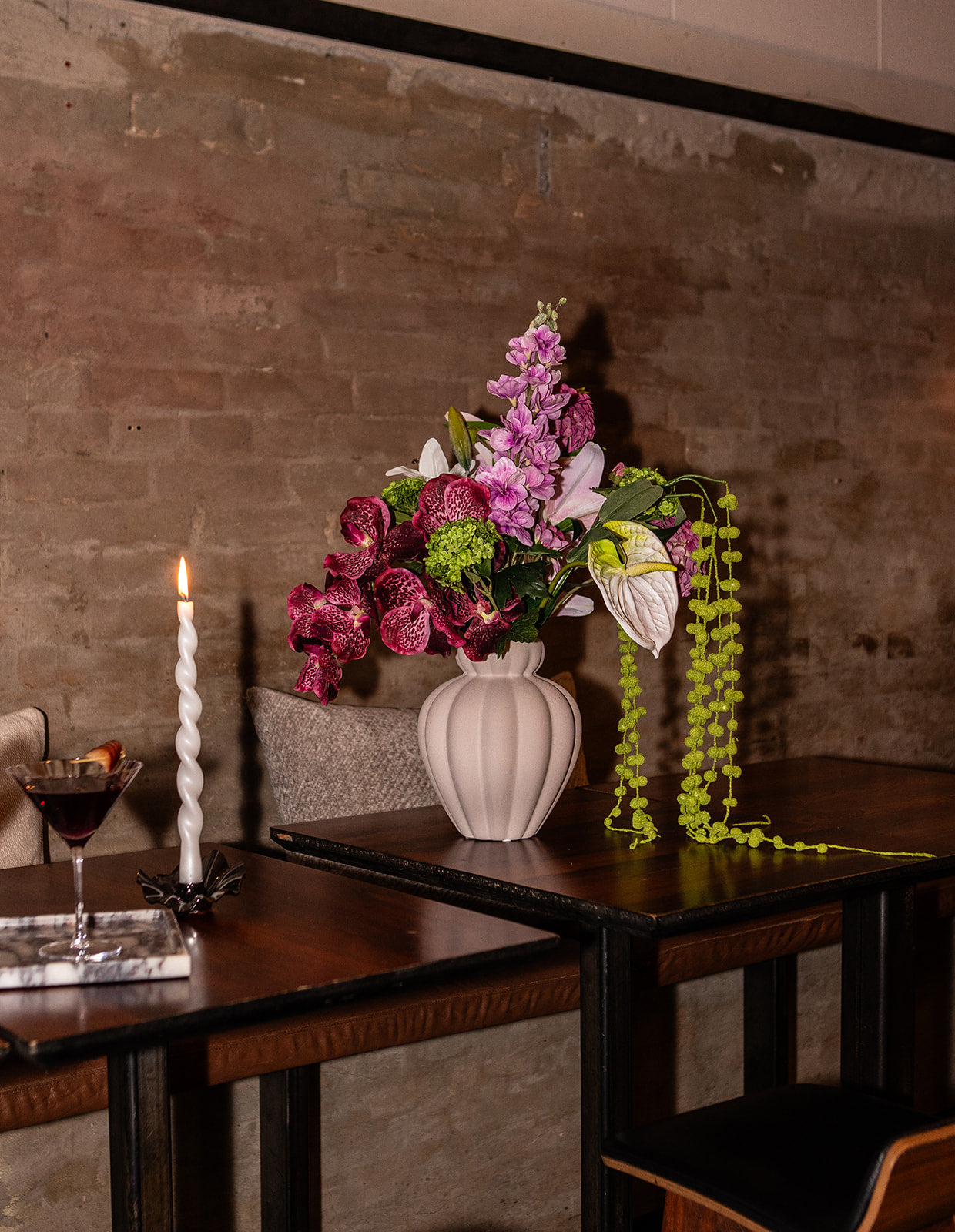 Pynt bordet med kunstige blomster i smukke vaser. De holder hele aftenen - og langt ind i det nye år. Skab små grupper af vaser i forskellige højder og farver for et levende, balanceret udtryk.