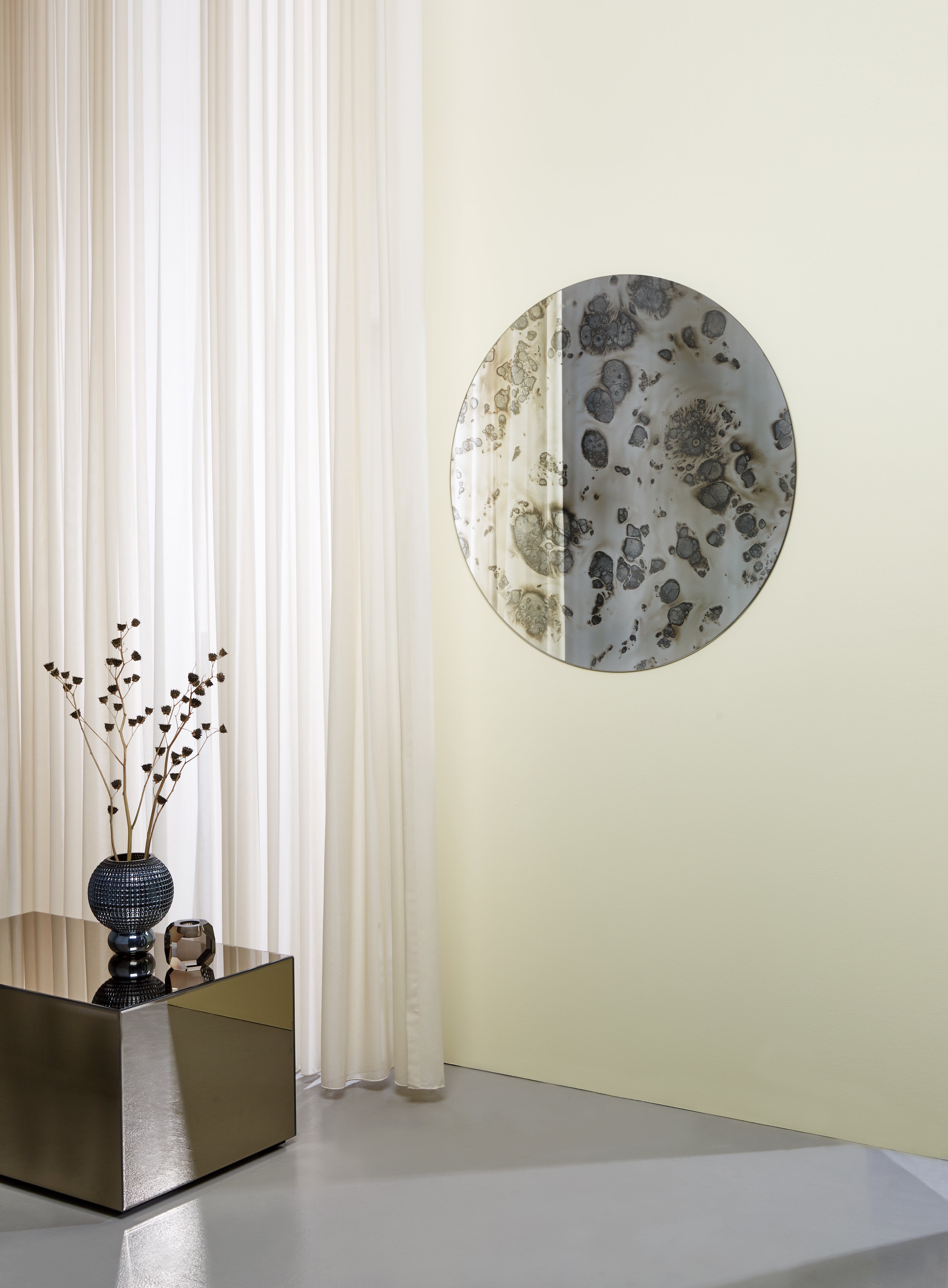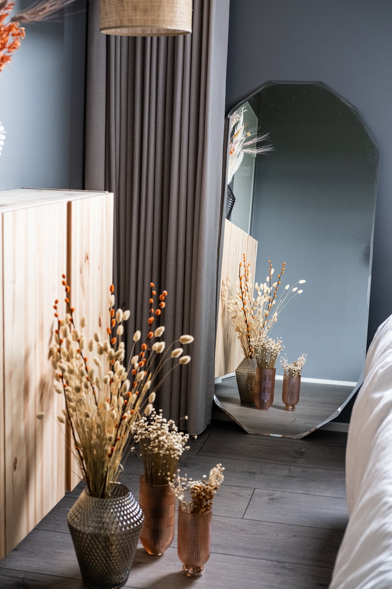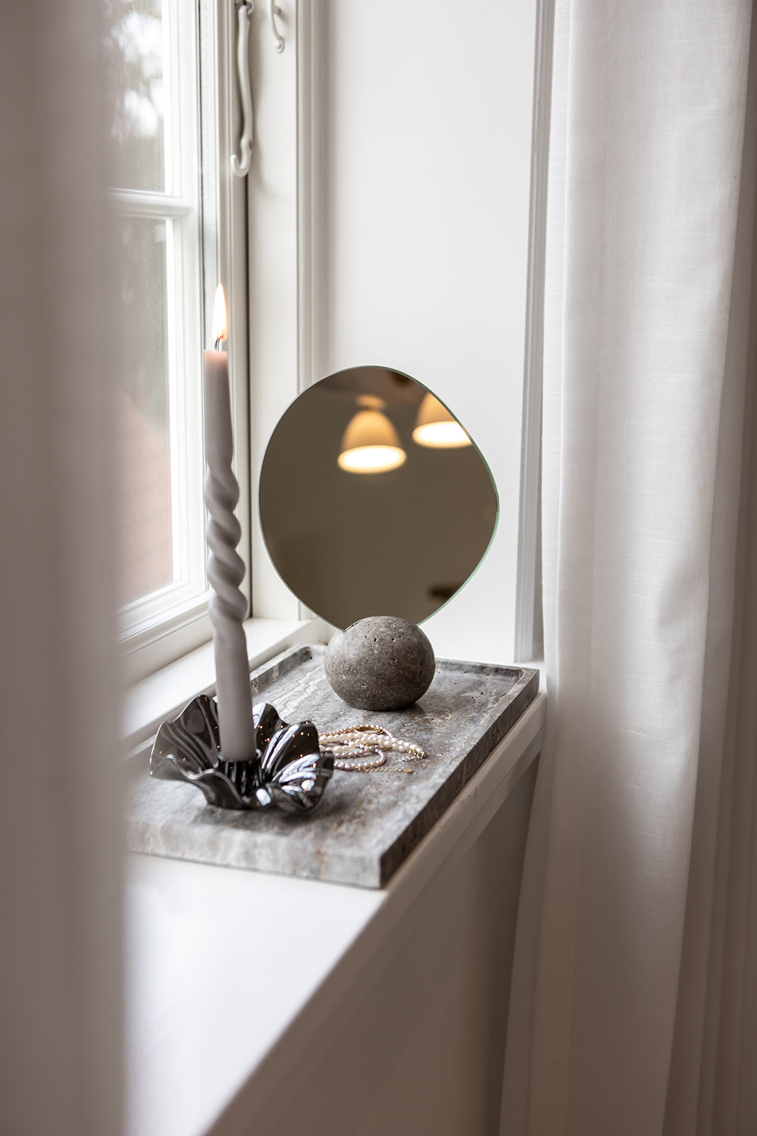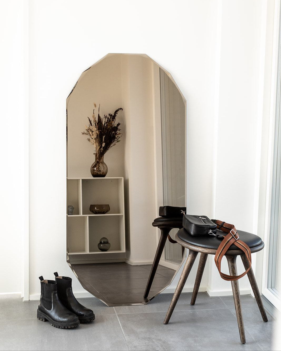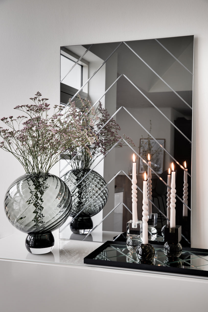 I stuen kan spejle være lige så vigtige som sofaen eller kunstværkerne på væggene. Et stort spejl skaber hotelstemning med sin rummelige effekt, mens små spejle kan tilføre fine detaljer og lethed. Vil du skabe en kunstnerisk kontrast, er organiske spejle eller asymmetriske spejle oplagte valg, som bryder de lige linjer og tilføjer en sanselig dimension. Når spejlet placeres, så det reflekterer grønne planter, levende lys eller et smukt møbel, får hele rummet et ekstra lag af dybde og liv.
