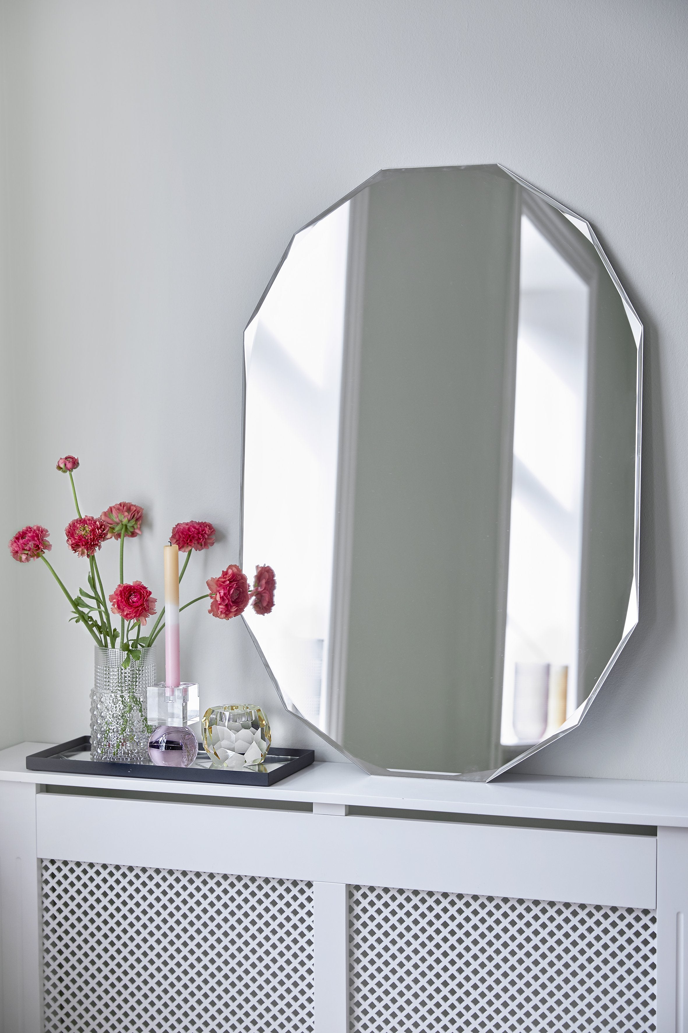 I spisestuen kan et spejl være med til at samle oplevelsen omkring bordet. Et ovalt spejl eller et rundt spejl tilfører blødhed og balance, mens et facetslebet spejl fanger lyset og skaber en luksuriøs glans under middagen. Placeret strategisk, så det reflekterer borddækningen eller en vase med blomster, tilfører spejlet en stemning af overdådighed og hygge, hvor hverdagens måltider forvandles til små festlige stunder.