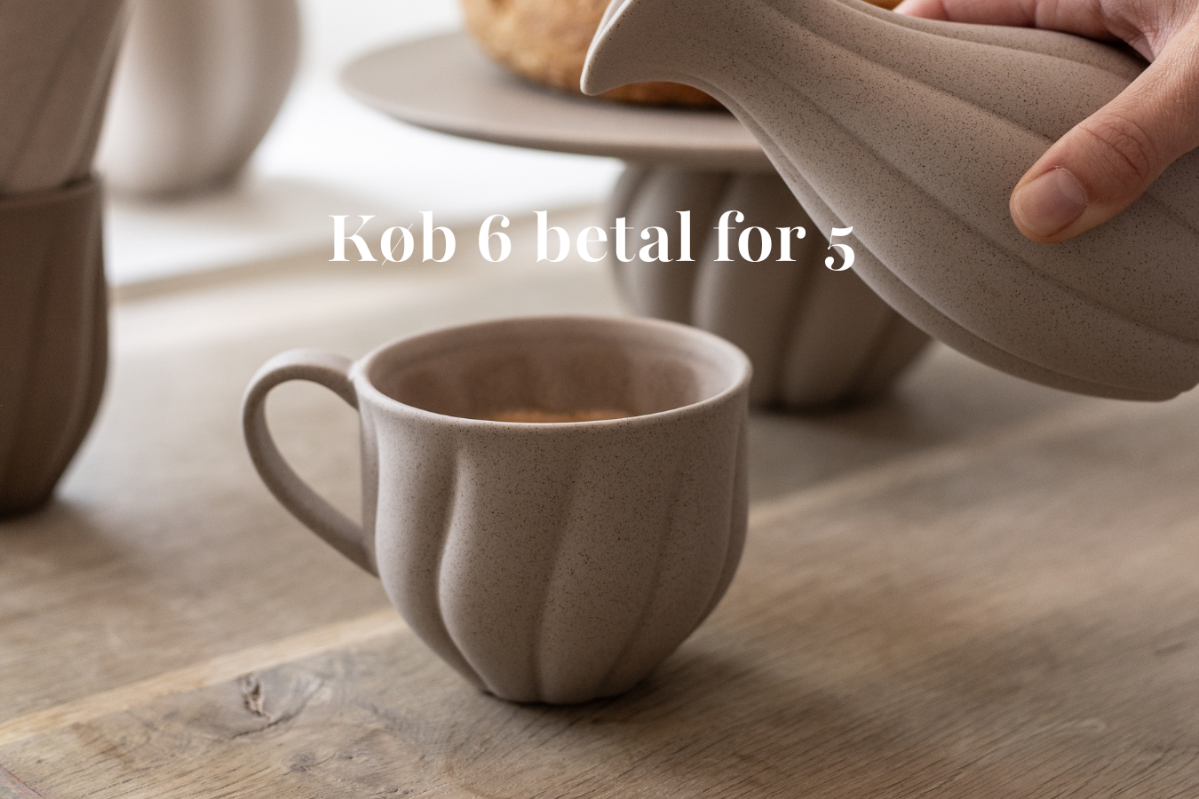 Når du vælger seks Nellie-kopper, giver vi den sjette med som en ekstra fordel. Det er vores måde at give lidt mere tilbage og gøre det lettere at udvide din samling af håndlavede kopper, hvor kvalitet og omtanke er i fokus.