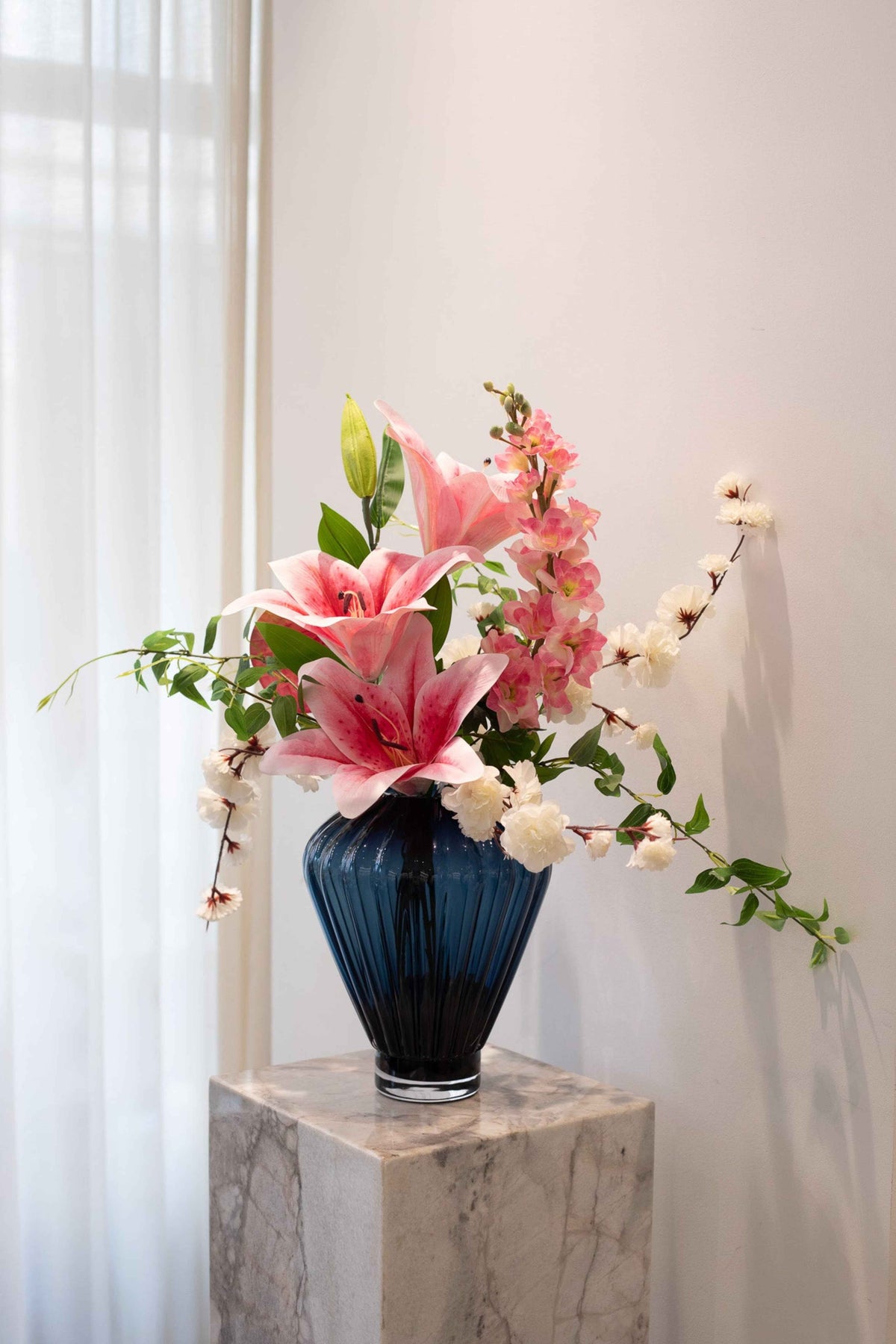 Alle vores buketter er professionelt færdigbundet af vores personale og fremstillet med naturtro kunstige blomster i høj kvalitet. De kræver ingen pleje eller vanding og holder sig smukke år efter år. Stilkene kan udskiftes, så du nemt kan variere udtrykket og opdatere din buket efter sæson eller personlig stil. Ved tilkøb af en vase kan du få klippet buketten til, så den passer perfekt. Du er altid velkommen til at kontakte os eller besøge vores butik i hjertet af Aarhus, hvor vi står klar til at hjælpe og rådgive dig med at finde den helt rigtige buket.