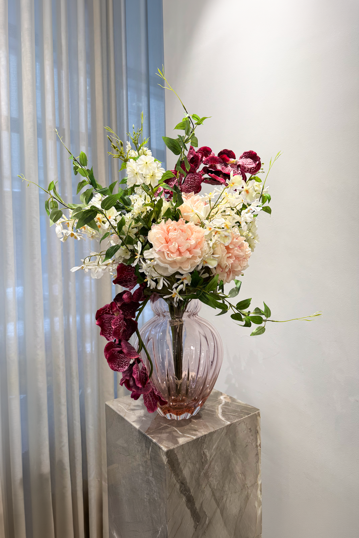 Alle buketter bliver færdigbundet af vores professionelle personale og består af naturtro kunstige blomster i høj kvalitet. De skal ikke vandes og står smukt år efter år. Ønsker du et nyt look, kan du nemt udskifte enkelte stilke. Du er altid velkommen til at kontakte os eller besøge vores butik i Aarhus, hvor vi gerne hjælper dig med at vælge den rette buket.