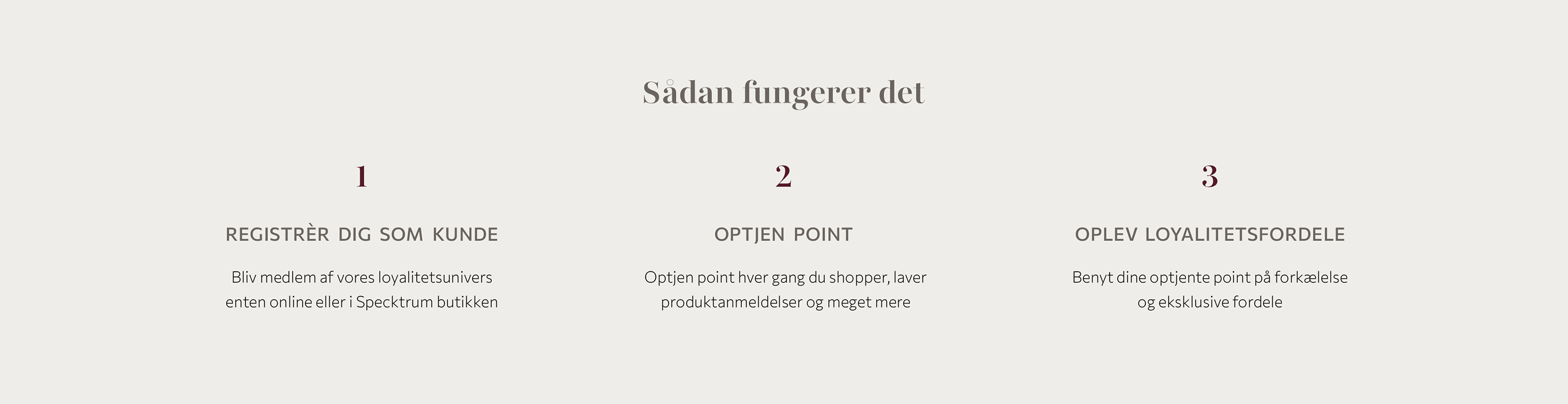 Hos Specktrum hylder vi de kunder, der vælger os igen og igen. Derfor har vi skabt et loyalitetsunivers, hvor vi giver lidt ekstra tilbage - med små gaver, særlige fordele og invitationer til øjeblikke, der gør indtryk. Læs mere om vores loyalitetsfordele her