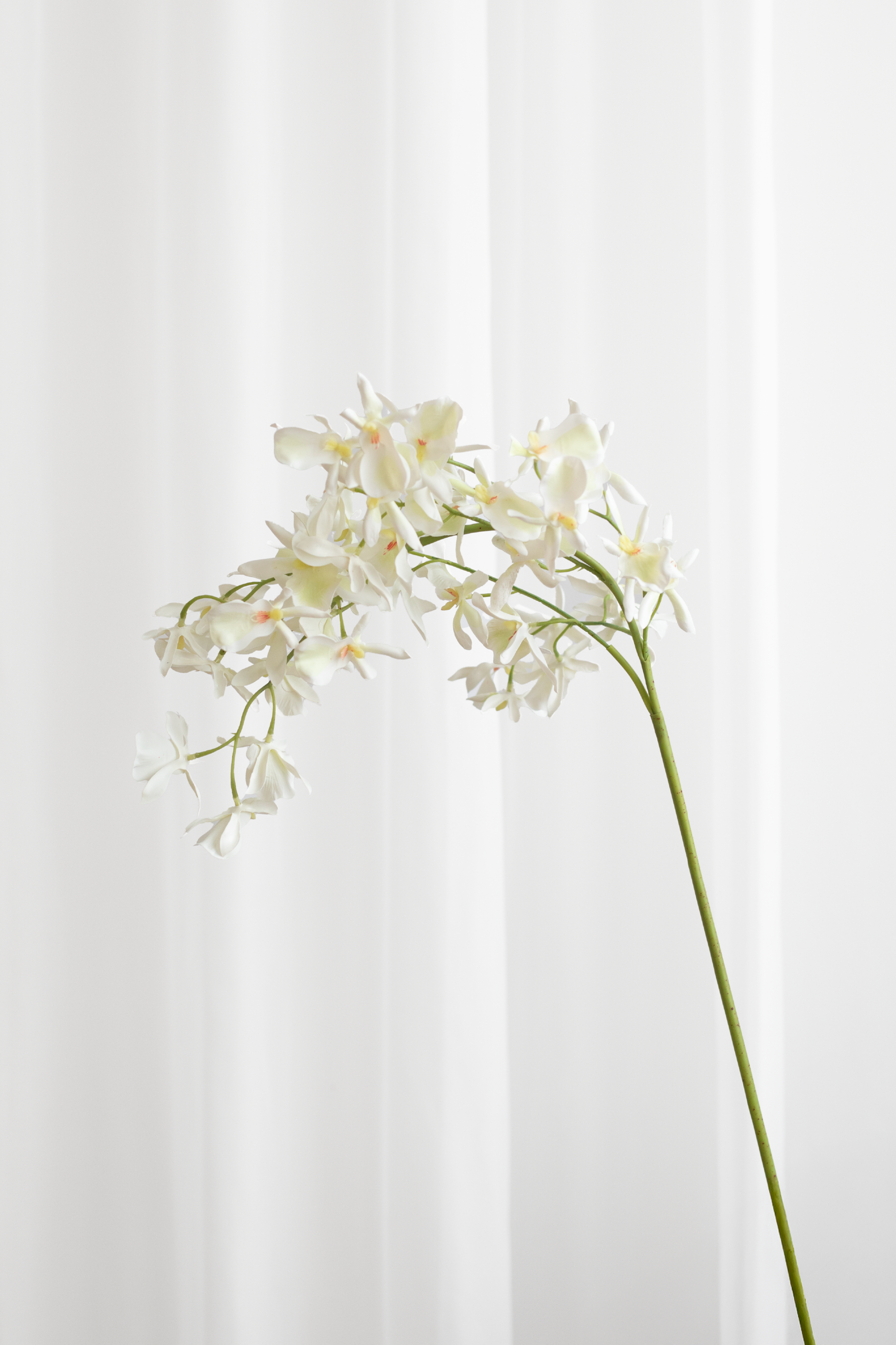 Bring et elegant og eksklusivt udtryk ind i hjemmet med denne smukke hvide orkidé med flere hoveder. De fine blomster og de realistiske detaljer giver et sofistikeret og naturligt look, som skaber en luksuriøs stemning – helt uden behov for vedligeholdelse. Vores naturtro, kunstige blomsterstilke er skabt med øje for detaljen, så de gengiver naturens skønhed på smukkeste vis. Med deres livagtige udtryk og tidløse skønhed er de et stilfuldt valg, der holder sæson efter sæson. Perfekte til at skabe smukke personlige buketter eller som enkle, dekorative stilke. Du kan også altid besøge os i Specktrum Store i Aarhus, hvor vi står klar til at hjælpe og vejlede dig med at sammensætte og binde en personlig buket, der passer til netop dine ønsker og behov.