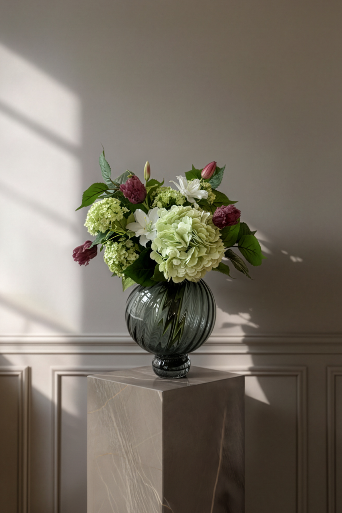 Den hvide og grønne base gør buketten anvendelig året rundt og velegnet til både private hjem og professionelle miljøer, hvor et roligt og ensartet udtryk er vigtigt.