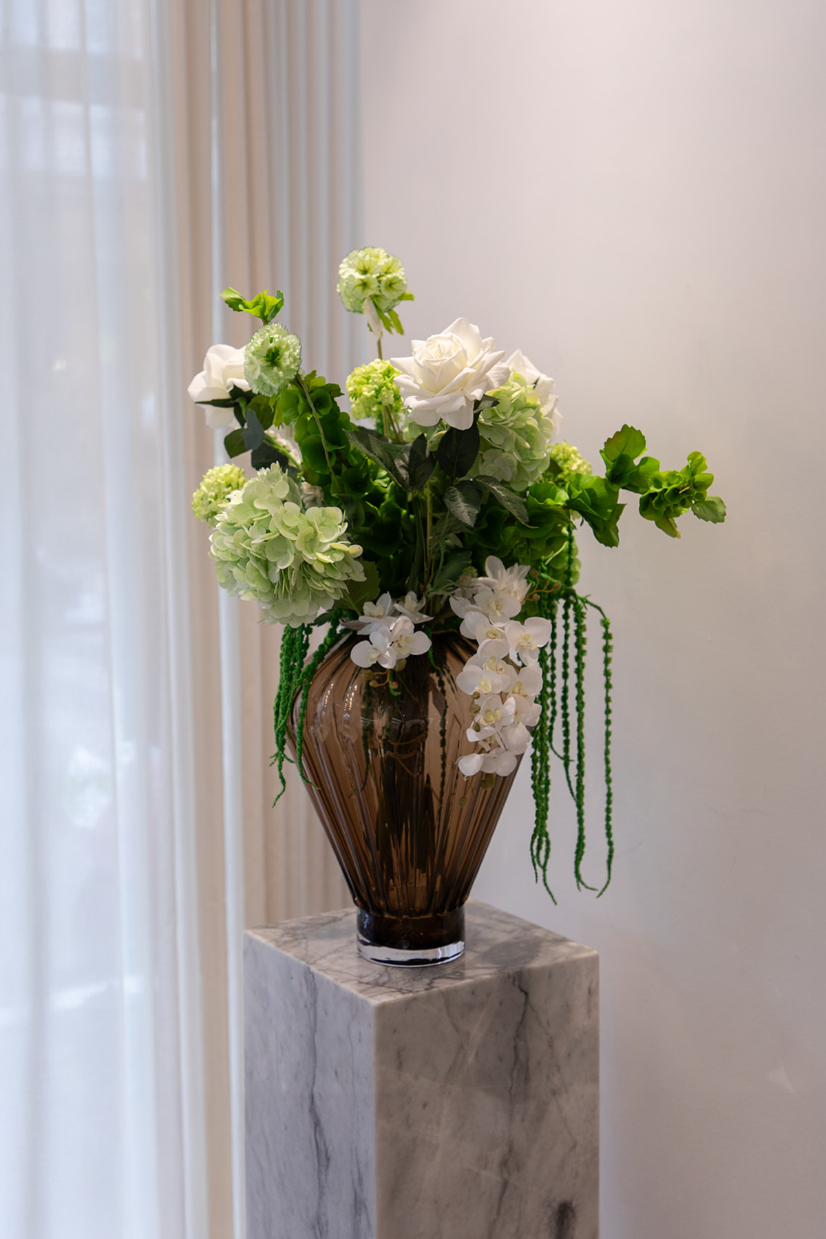 Luftig romantik - Buket 13 er en lys og elegant buket i hvide og grønne nuancer, der giver et let og friskt udtryk. Den naturtro sammensætning af blomster skaber en følelse af renhed og romantik – perfekt til dig, der ønsker et tidløst og harmonisk element i hjemmet.