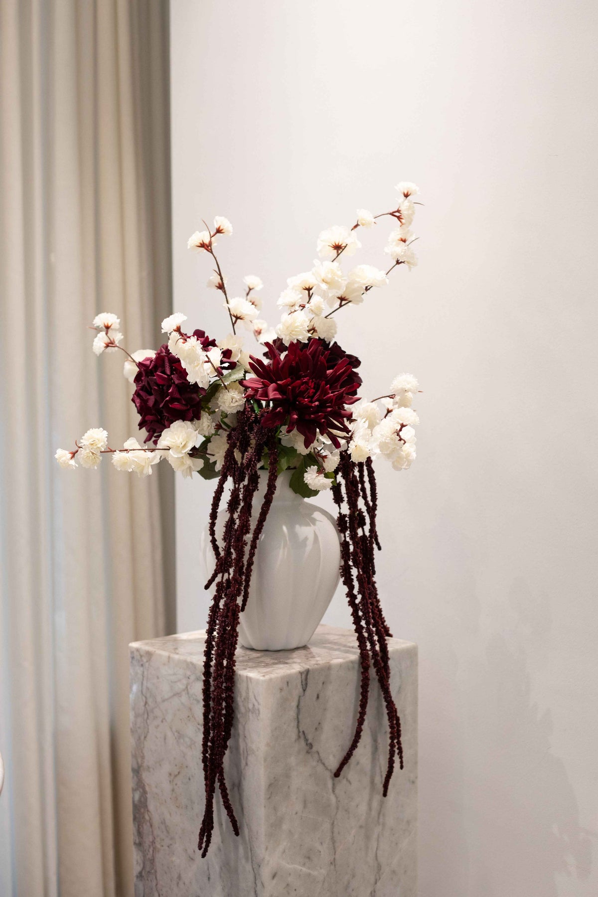 Dybrød elegance Bourgogne Brise er en dramatisk buket med dybe vinrøde blomster, lette cremehvide grene og lange, hængende detaljer, der giver et levende fald. Kontrasten mellem de mørke nuancer og de lyse blomster skaber et elegant udtryk, der tager sig smukt ud.