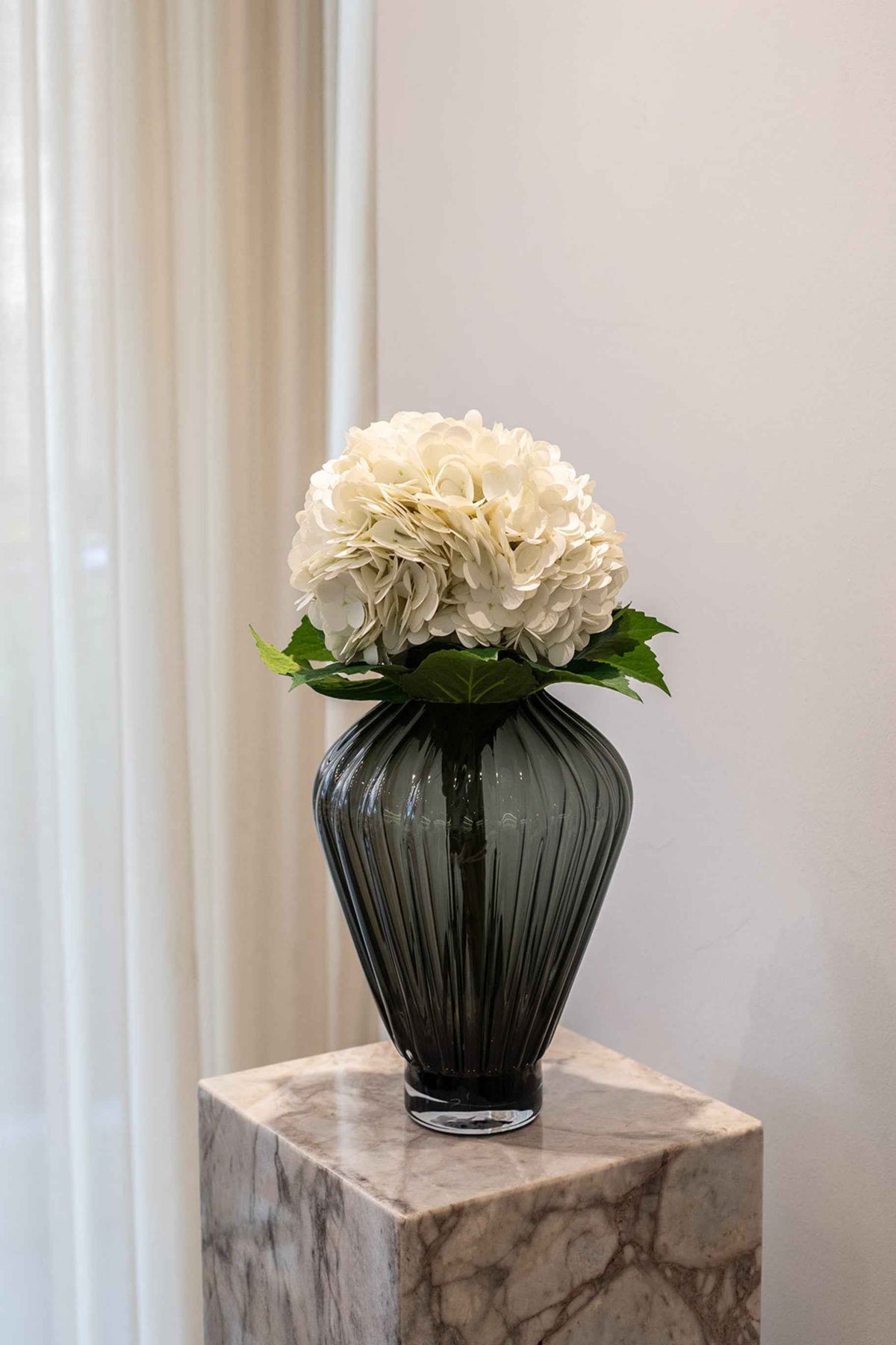 Spar 58%Ravfarvet glaskande med rund form og kort fod. Kanden har en klar glas-hank og en markeret hældetud. Produktet er fotograferet mod en hvid baggrund.Simplicity Karaffel - Guld | Rund