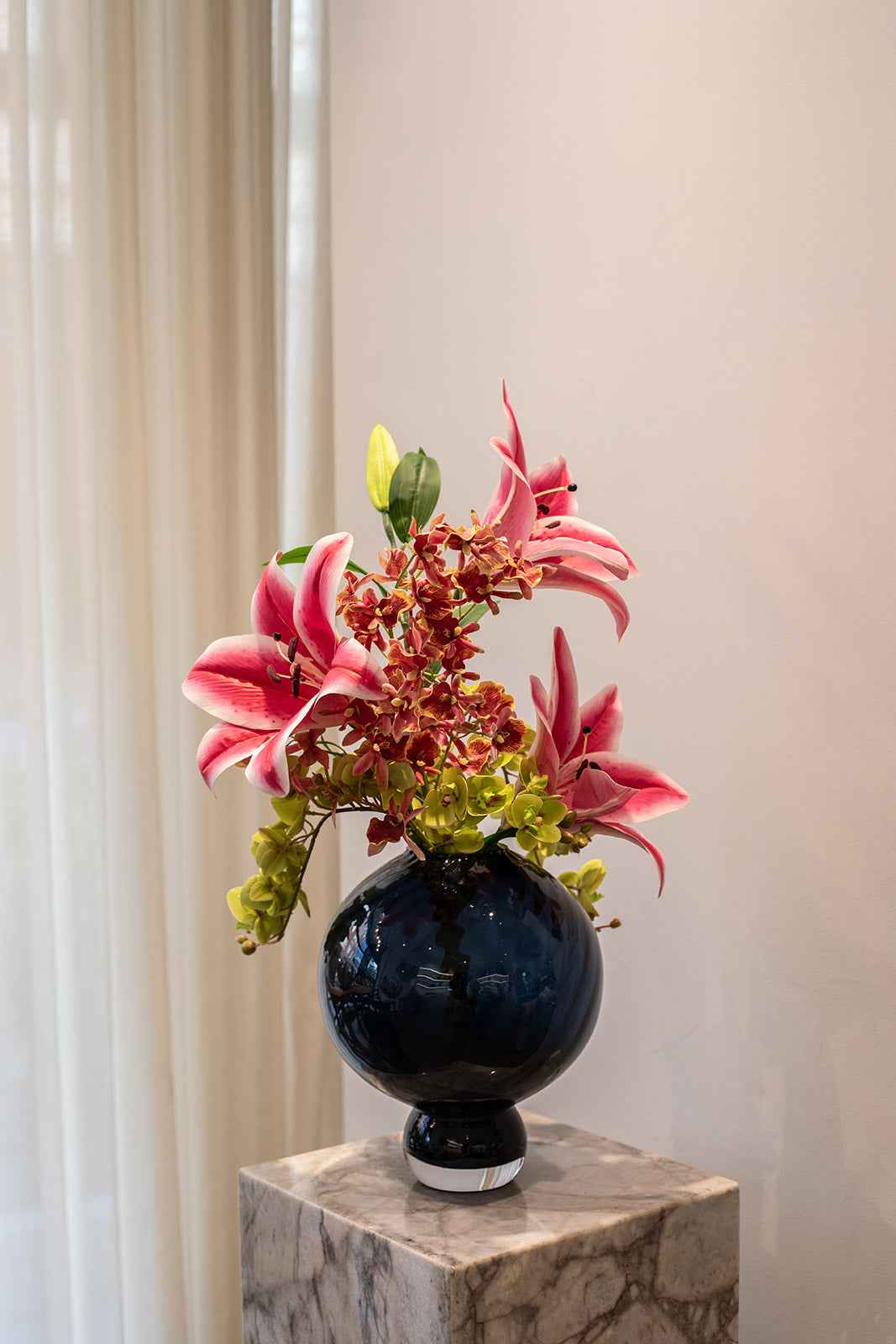 Alle vores buketter er professionelt færdigbundet af vores personale og fremstillet med naturtro kunstige blomster i høj kvalitet. De kræver ingen pleje eller vanding og holder sig smukke år efter år. Stilkene kan udskiftes, så du nemt kan variere udtrykket og opdatere din buket efter sæson eller personlig stil. Ved tilkøb af en vase kan du få klippet buketten til, så den passer perfekt. Du er altid velkommen til at kontakte os eller besøge vores butik i hjertet af Aarhus, hvor vi står klar til at hjælpe og rådgive dig med at finde den helt rigtige buket.