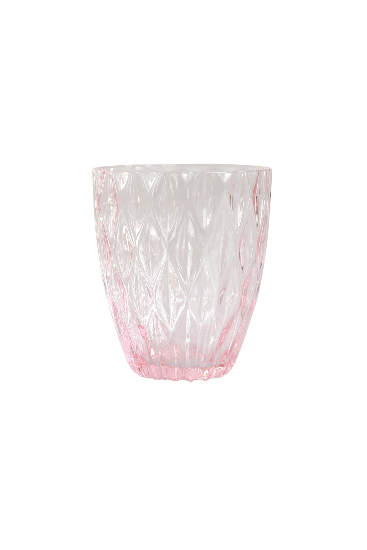 Lyserødt drikkeglas i facetslebet glas med diamantlignende mønster.
