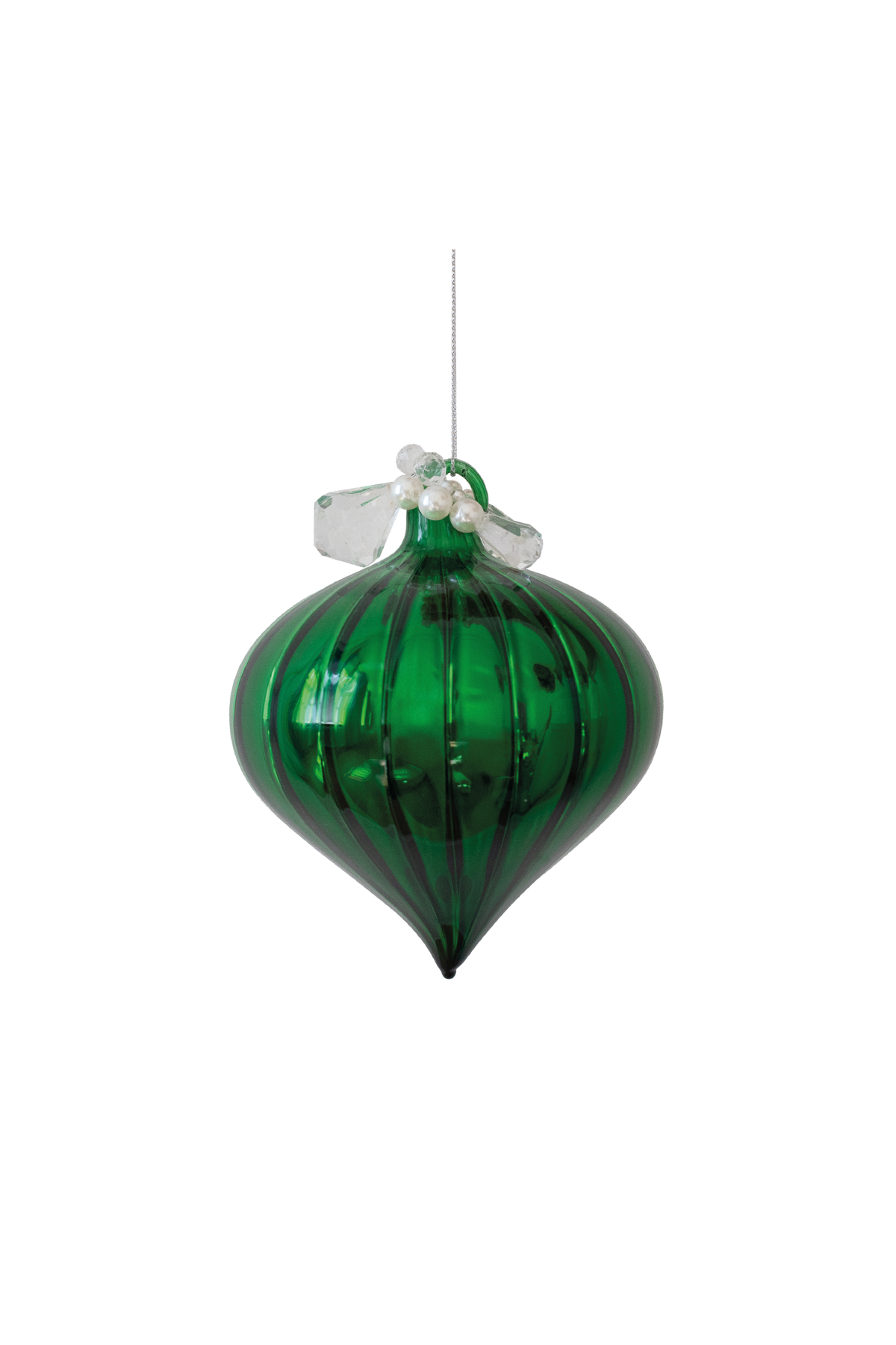 Dråbeformet julekugle i grøn med linjer og krystaller samt perler i toppen