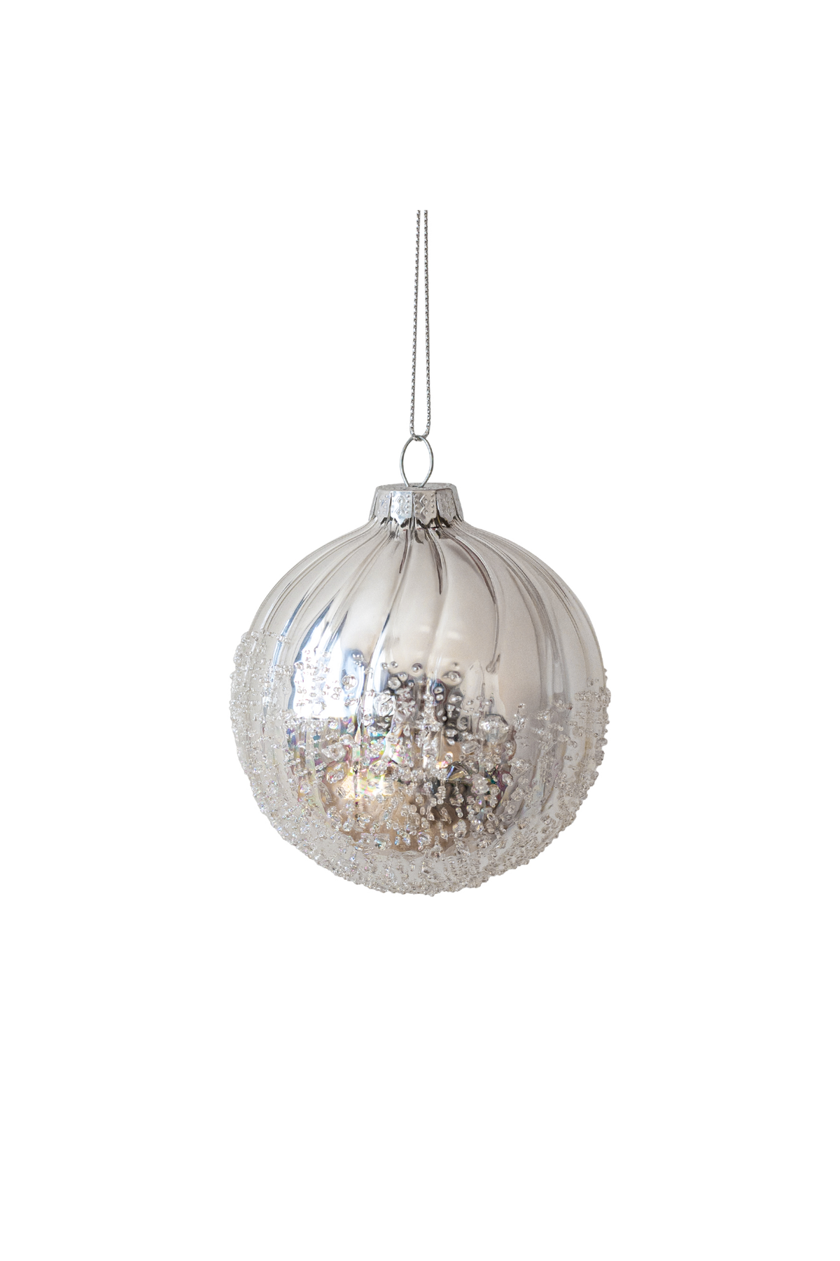 Denne sølvfarvede julekugle med sin frostlignende tekstur nederst tilfører et elegant vinterligt udtryk og er perfekt til både klassisk og moderne julepynt.